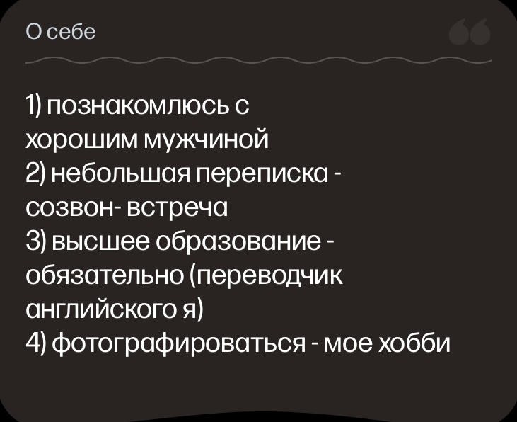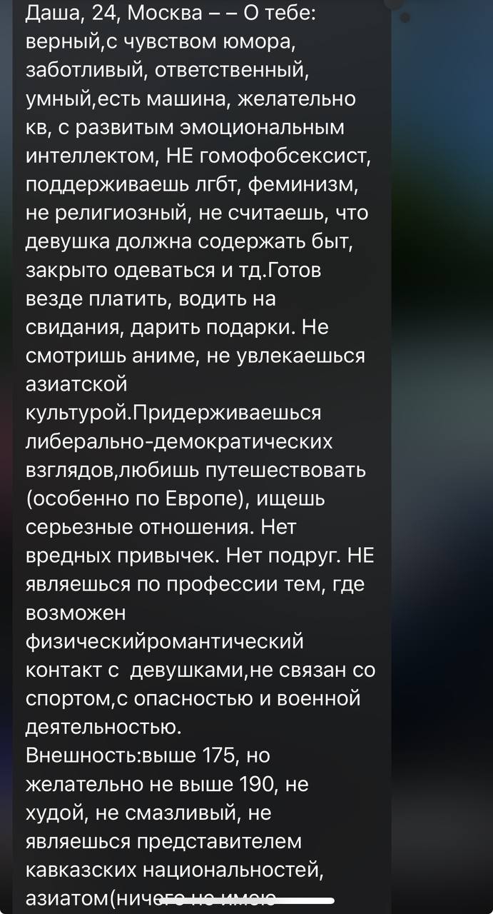 >>10359286 > Ну лично я пришёл к выводу, что в профиле нихуя кроме интересов писать не надо. Это я подчеркнул в древнем видео Никиты Мартынова: что бабы читают все твои шутки, филосовские фразы, пожелания к паре, описание жизни...и делают вывод, что ты ебнутый. Просто из любой хуйни, какой бы замечательной и глубокой тебе она не казалась, цель бабы читающей твоей анкеты - доебаться что что-то не так и заигнорить. Они доебываются и игнорят. Да, наверное если написать что ты менеджер Газпрома - то это их обезоружит. Но я не менеджер Газпрома. Логично. Что-то указать можно, но много расписывать будет только отталкивать.