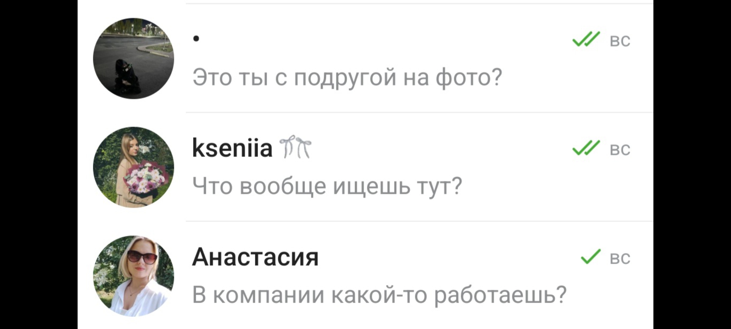 Блять, что вы тут обсуждаете? Лайки от жирного неликвида, который нахуй никому не сдался? Нормальный анон, когда пишет про то, что нет взаимности имеет ввиду сочных зумерш до 23 лвл. А то что вы тут скидываете и даёте советы нормальный анон может в день по 3 штуки ебать