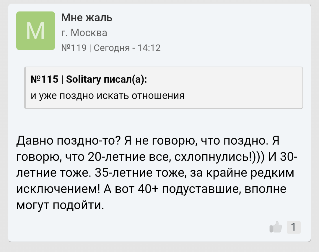 В общем, если ты не реально смазливый и обеспеченный то шансы на СЗ околонулевые. И если не молодой, мне 37 лет уже. Сколько уже лайков отправил и зиро. При этом от тян лайки если и бывают, то с частотой 2-3 в месяц. И тян там там либо такие, что ну совсем мне никак, либо которые хотят развести тебя на деньги. И ведь я ровесниц ищу, не студенток.