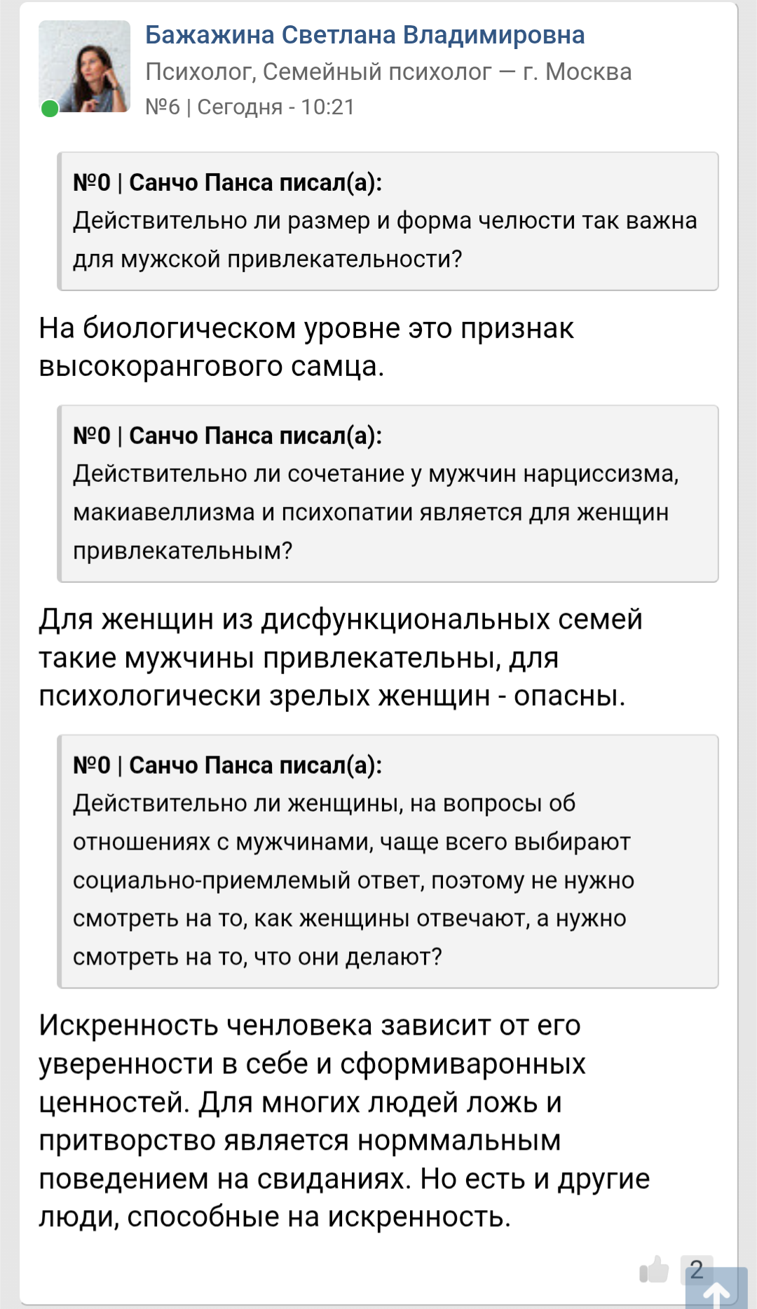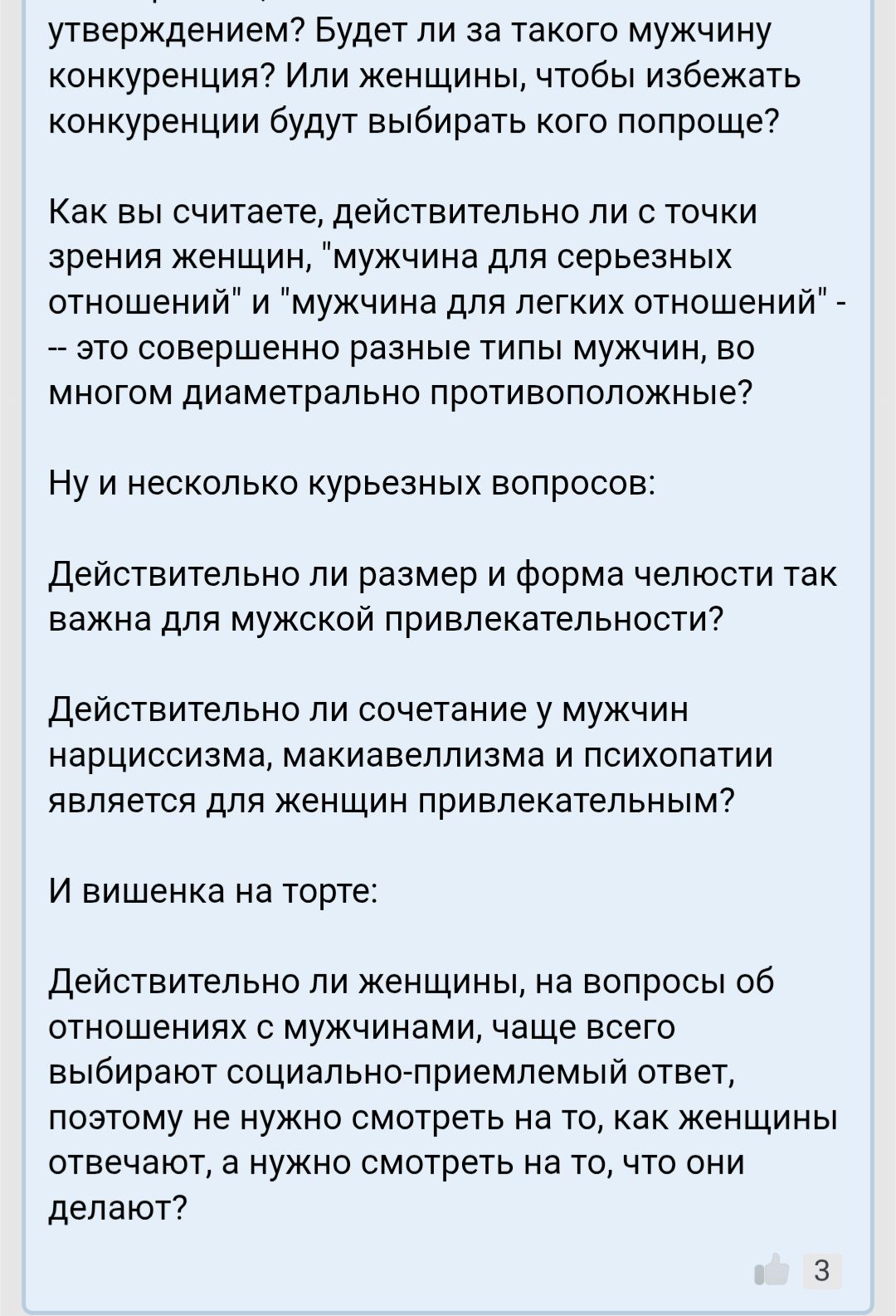 Я к чему про нее рассказываю. Некоторые женщины (их мало) выбирают совсем не по внешности. Это вы, местные долбоёбы всё считаете что люди всегда и везде выбирают исключительно только по внешности. Нет, это не так. Многие осознанно внешность игнорируют и смотрят что есть внутри.