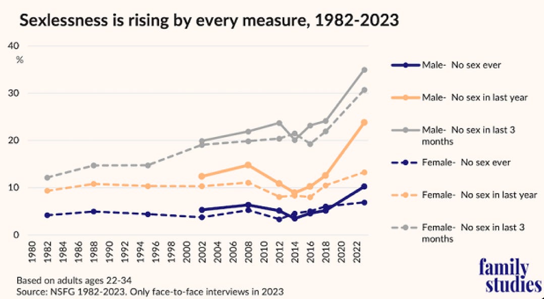 В США доля молодых мужчин в возрасте от 22 до 34 лет, которые утверждают, что не занимались сексом в течение последнего года, удвоилась в период с середины 2010-х по 2022 год. Тезис «секс слишком переоценён», который всё больше утверждается в молодом обществе, касается и молодых женщин, но всё же в чуть меньшей мере.