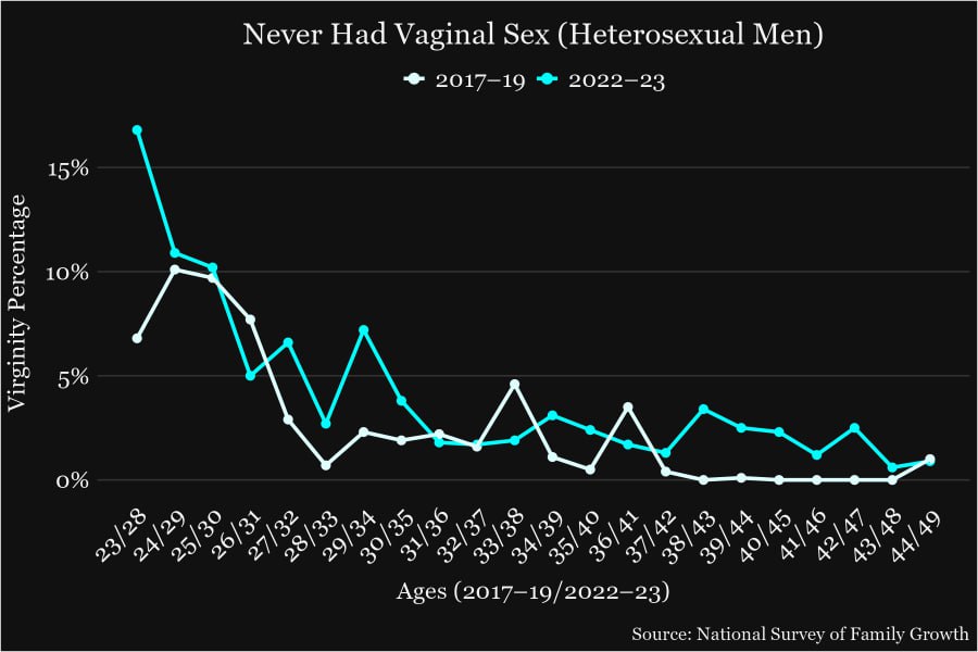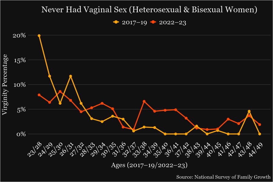 Среди молодых женщин идёт обратный процесс – у них стало больше гетеросексуального секса. В 2022-2023 годах только 8% молодых женщин в возрасте 22-28 лет были девственницами, а в 2017-19 годах – 20%. (и такие огромные изменения – всего за 4-5 лет)