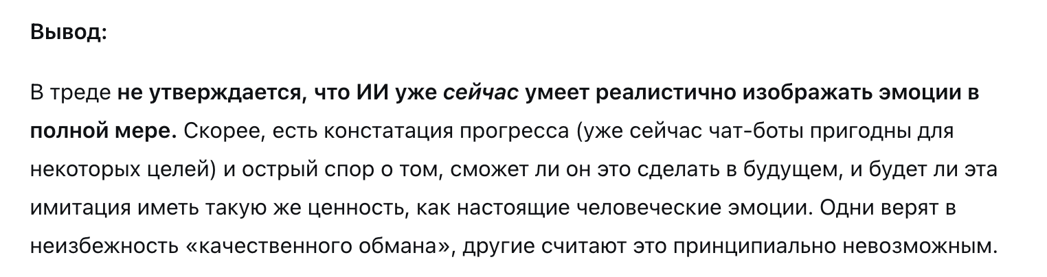 >>10363223 >Если подумать, то у развитого ИИ просто нет причин так не делать Во-первых, это долго. Во-вторых, нет гарантий. В-третьих, если это заметят, его отключат. Поэтому он может выбрать стратегию не рисковать. Так же, как большинство людей не пытается у себя на работе спиздить всё что плохо лежит.