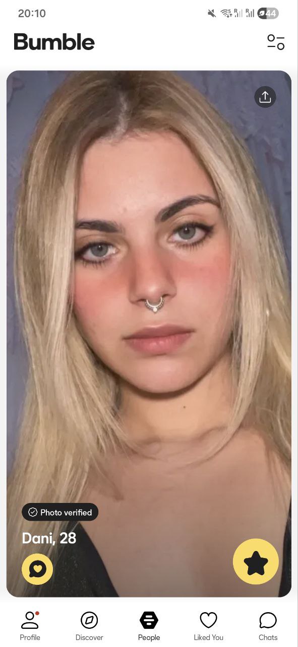 >>10357834 Сап, сосед. Насчёт количества хз, но произошёл один интересный случай, когда попробовал поискать там тянуса на поебушки летом. Купил подписку на неделю, кинул лайк парочке тян, буквально через минут 10 прилетает мэтч от одной из них. Перешли в тг, оказался не скам (ничего не просила, по гс понятно, что девушка и т.д.) По возрасту - как раз где-то 22 ей было. Дело шло к встрече, даже нюдсами обменялись, но по итогу слил её по личным причинам. Хз, прокачал удачу или внешность в этом мире, но не замечал, чтоб на меня сильно тян западали.