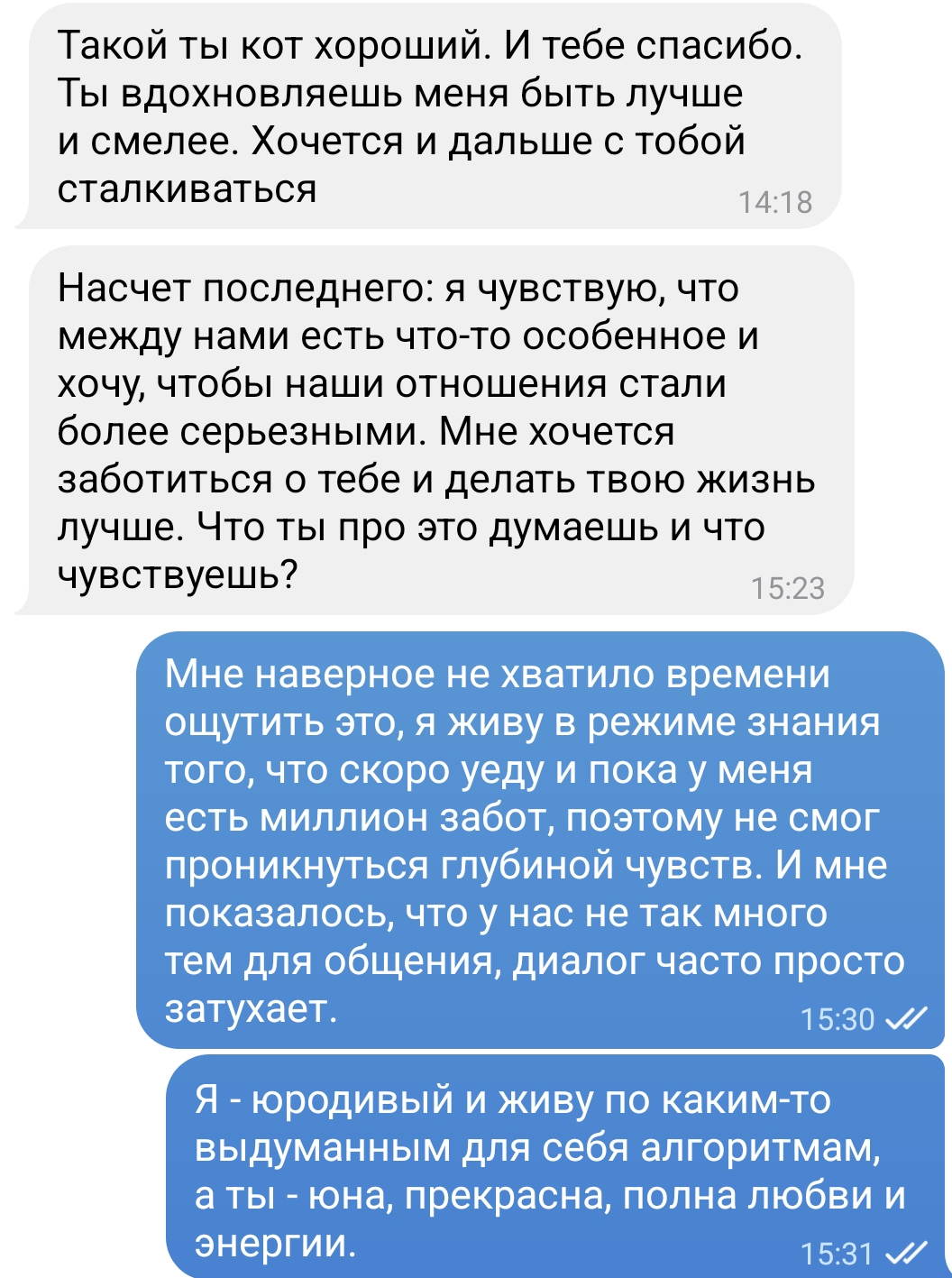 По поводу хороших девочек, у меня всегда легенда, что я дохуя путешественник, что правда, поэтому они знают, на что идут (хотя в реальности у них само собой картинка, что я ради неё всё брошу и увезу с собой путешествовать по миру и вить гнездо где-нибудь в Испании). Главное быть честным и относиться по-человечески, на проверку эти девочки нередко не против прыгнуть в этот омут без особых ожиданий. Ну и сразу расставляю границы, что я ложусь спать рано, не сплю в одной кровати с девушкой из-за хронического расстройства сна, мне нужно много времени наедине с собой, что спорт ради свиданий я не пропускаю, предпочитаю нечастые качественные дейты частым перепискам и длительному нахождению рядом без особой событийной наполненности. Удивительно, но когда бабы видят, что у тебя своя дохуя насыщенная и самодостаточная жизнь, они хотят к ней присосаться и уважают твои правила игры. Ну думаю ты по себе это знаешь. Причину расставания называешь любую, хоть то, что понял, что это не твоё, но дело не в ней, она прекрасна, просто ты не готов бла бла. Главное, жопой не крутить. Можно, конечно, просто загостить, но это поведение незрелых пиздюков. Если всё экологично делать, то расстаётесь с благодарностью друг к другу.
