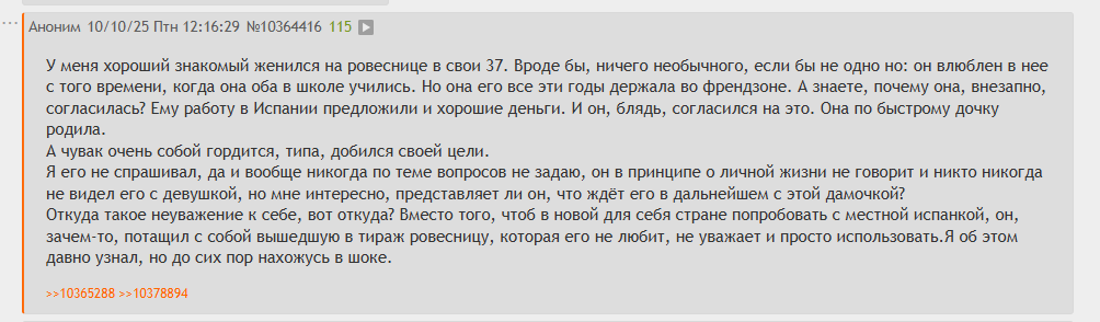 >>10381614 Ну вот мне и тут не особо повезло. Видимо, по юности был просто глуп и сильно было самовнушение с дества, что рост не важен, что чуть красивее обезьяны и я верил, хотя все говорило об обратном, даже на примере того универского приятеля. Причем, мне даже почти напрямую давали понять, что я такой себе. Я пилил много раз стори, как однажды стоял со знакомой между парами, курил, беседовал и к ней подъехала подруга что-то отдать. И когда она отчалила, я спросил у своей знакомой, мол, свободна ли твоя подруга? Она мне очень понравилась. Та на меня очень странно посмотерла, с каким-то удивлением, даже, и ответила, цитирую: Как бы тебее сказать...Ей немного другие парни нравятся. Я в тот момент даже уточнять не стал, какие именно, но запомнил на всю жизнь ту фразу и осознал ее только лет 10 спустя Или момент один, когда я гулял с приятелем и к нам присоеденились его сестра. Мы беседовали все вместе и я ради шутки сказал, контекст уже не помню, что типа, я красавчик. Его сестра тут же скрвила лицо: Ну я бы не сказала... И таких моментов было очень много, просто я коупил. Помню, я еще часто думал, почему же ко мне девушки не подкатывают никогда. Знаешь, чем я коупил? Что они стесняются меня! Прикинь? Я хорош собой, а они просто боятся подкатить! Пиздец дегенерат
