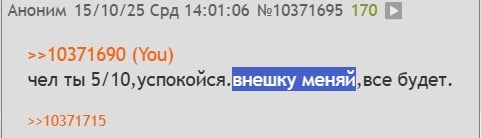 >>10381308 >Изучай статьи на луксмакс орге Не интересно. Я вопрос практикующим луксмаксерам задал, практикам, а не теоретикам. Ну и на на росте я не помешан и не комплексую, ну в кроссовках абибас рост 175см, энивей мне похуй на рост, это не предмет переживаний вообще, меня больше внешка парит, ну все описаные изъяны. Может кто из анонов с такими же проблемами был, лёг под нож/к зубному сходил и ему это буст дало нереальный.