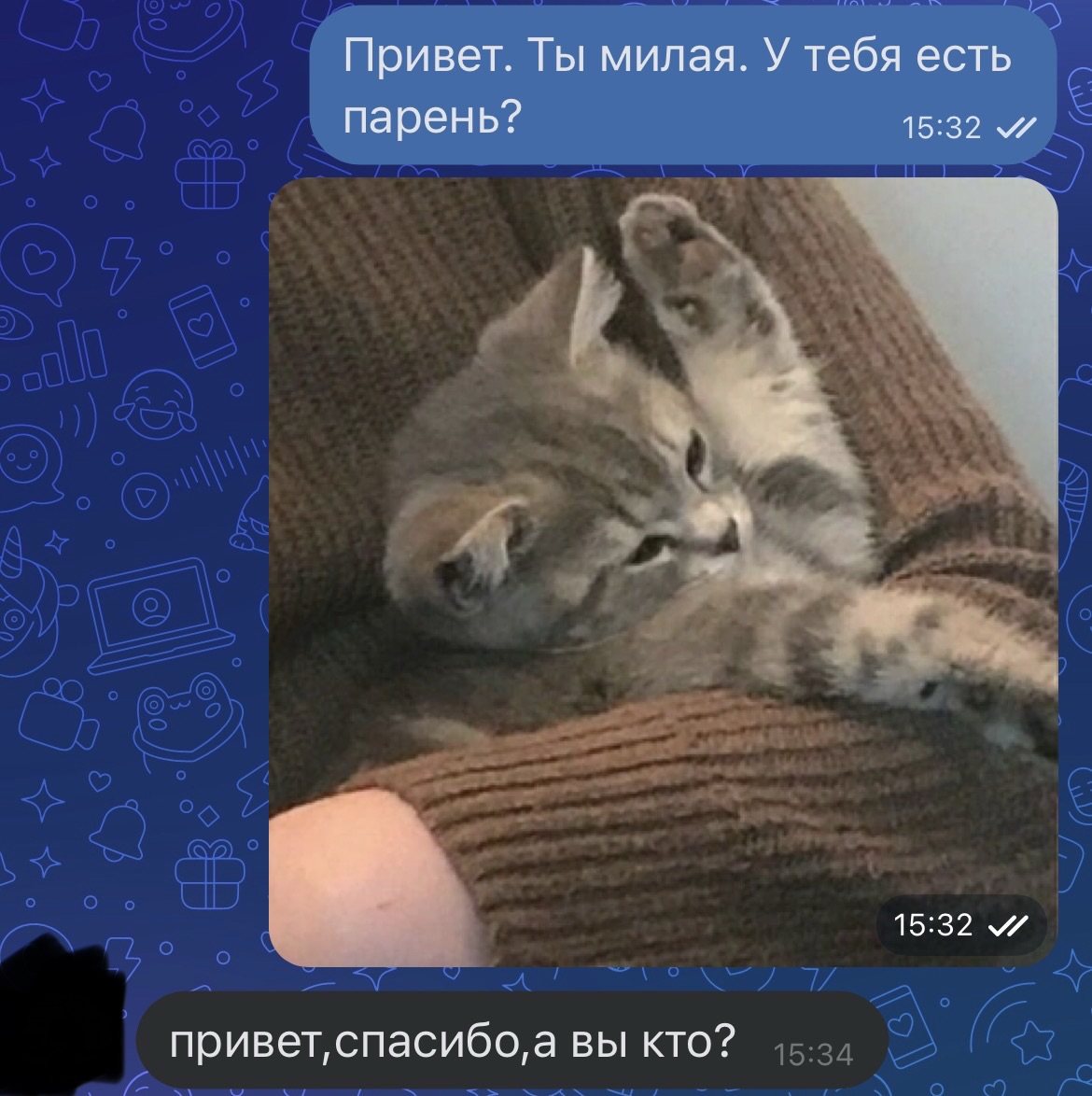 >>10384586 Ну, отвечает из вежливости. Могла вообще нах послать - незнакомцу давать личку и пиздеть про пирог же ебать как интересно. Должна на хуй прыгнуть сразу?