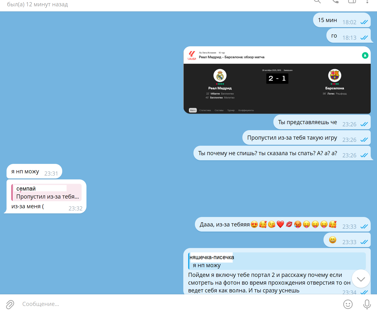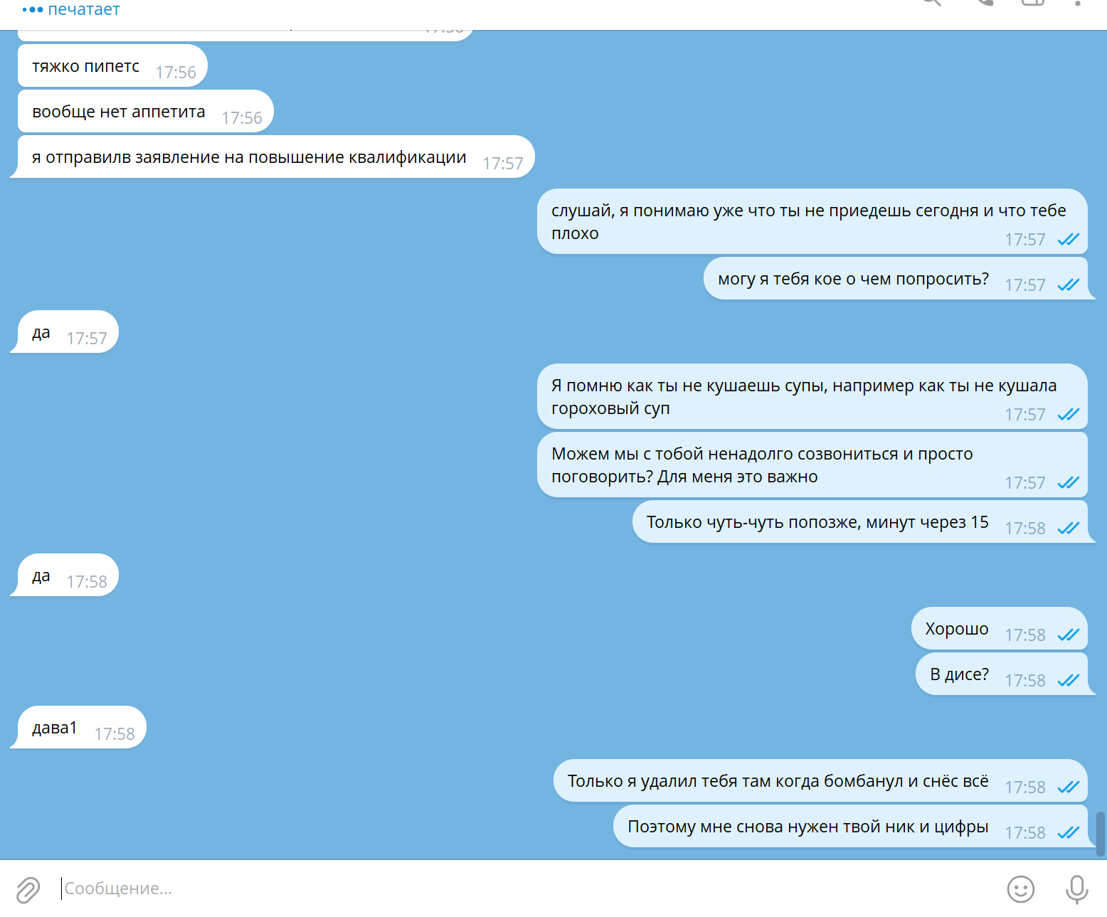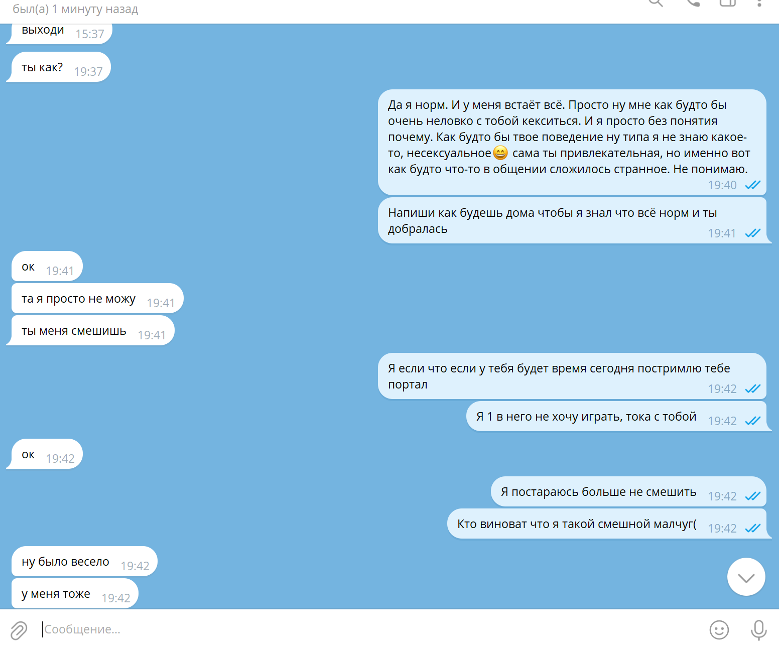 В общем аноны, пока был на футболе, обменялся с ней парой сообщений и вот что из этого вышло. Что я хочу сказать. У меня план такой - я хочу позвонить ей и откровенно поговорить. Чтобы снять неопределенность и создать конкретику. Я прокручивал в голове диалог и вопросы которые хочу ей задать. Сейчас выпишу их еще на блокнот чтобы не забыть ничего. Я хочу поговорить с ней напрямую. Вопросы будут из разряда - кем ты меня считаешь? (парнем/другом/потенциальным парнем), был бы у тебя с кем-то секс за это время? И так далее. Поскольку у меня 0 доказательств того что она меня наебывает и я нахожусь в ситуации неопределенности долгое время - я так и скажу ей. Как есть. Что чувствую себя плохо и тревожно. Скажу что меня беспокоит. Что мне не нравится. Что я хочу. И задам все свои вопросы. Пожелайте мне удачи.