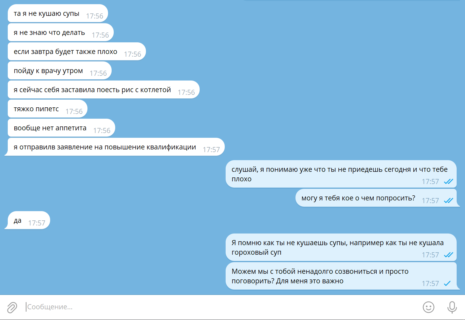 >советовали вести с ней смолтолк как у вас было летом У меня по какой-то причине нет желания ей писать даже. Не знаю почему. Просто ощущаю так. Но специально для двача я ей сейчас напишу и попробую смолток. О результатах сообщу)