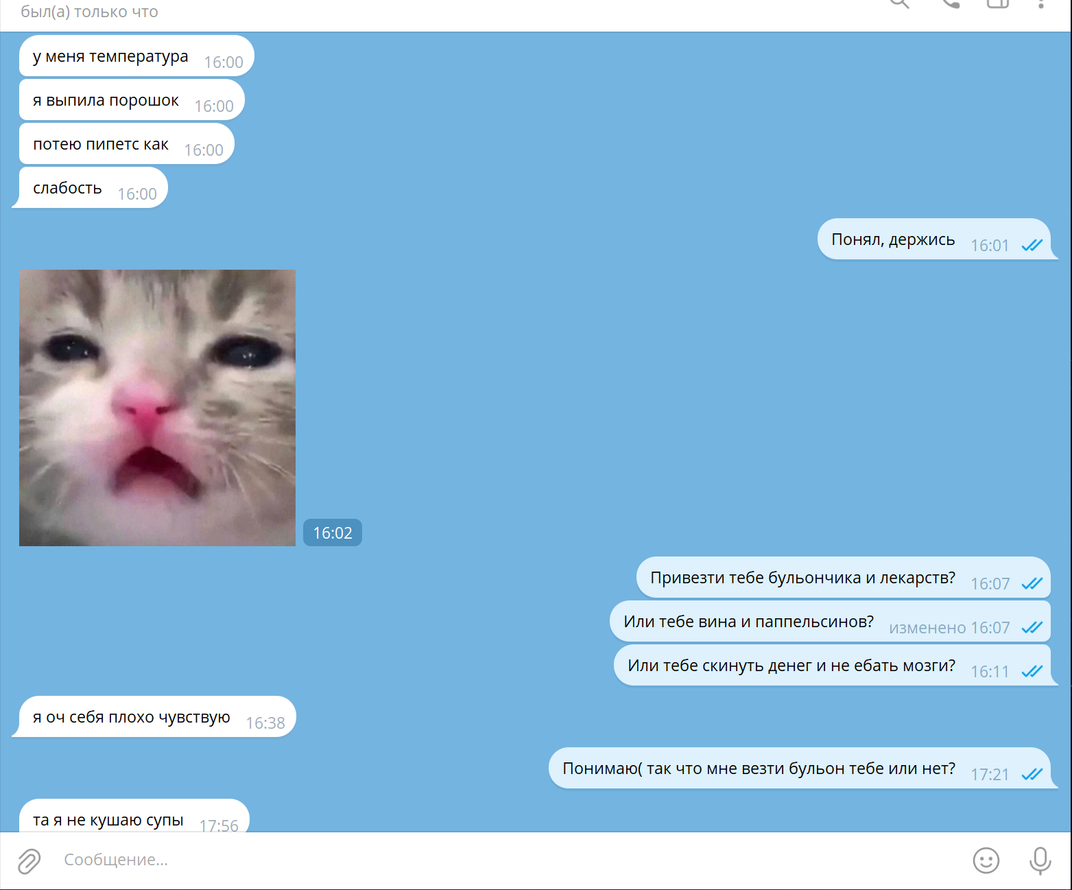 И теперь >>10386637 >Баба 5 дней кроме поздравления с др мне ничего не пишет.