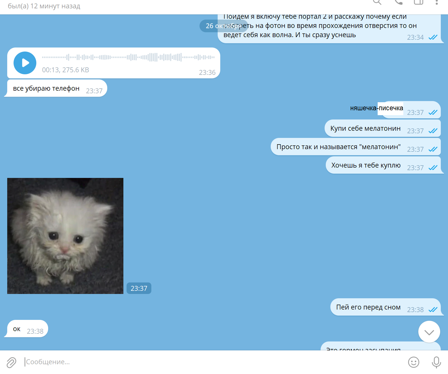 >>10391212 В общем поговорил с ней, задал ей свои вопросы. Постараюсь передать основную суть. 1. У неё не простые отношения с отцом. Я так и не понимаю что там конкретно не так, но какие-то непростые отношения, она пыталась ему что-то донести в воскресенье своим звонком, а он типа того из всего понял только какую-то хуйню. 2. Она не может сказать есть ли у неё ко мне чувства, типа "не знаю" в общем. Но я ей нравлюсь. Говорит "ты мне нравишься". 3. Сказала что за время нашего с ней общения у нее никого не было, ни с кем не общалась и не знакомилась. 4. Говорит, что много людей заметили, что она изменилась, ну мол депрессуха у нее какая-то, осенняя или хуй знает че. 5. У нее есть некоторые друзья-пацаны, но общение с ними обычное, дружеское, типа поделиться чем-то, поугарать, не более того. Это какие-то коллеги на работе и парочка вне работы (у одного из них есть девушка, второй друг её бывшего). 6. Ее обидели некоторые вещи которые я делал с ней. Долго тянул. Когда-то где-то пизданул что она "инфантильная", "как ребенок" (сам не помню уже этого), что пизданул ей что я не унитаз для слива негатива, а она просто хотела поддержки. 7. Я прямо сказал ей что у меня есть к ней чувства и я хочу писать ей, видеть ее и тд. Попытки выяснить почему она общается со мной не так бодно ни к чему не привели. Мол "я не знаю что со мной". 8. Провела почти весь вечер со мной. Созвонились 4 часа назад. Поговорили. После этого 2 часа постримил ей дейзи, она смотрела, ей было интересно, потом перерыв, скачал портал 2, еще полчаса поиграли и она сказала что ее рубит, хочет спать. (ей завтра в 7.30 вставать в отличии от меня овоща-удаленщика). Ушла спать. Я ей сказал пиши мне. Пиши всё и обо всём. Она сказала что-то типа "ладно". "Ты мне тоже". Пока всё.