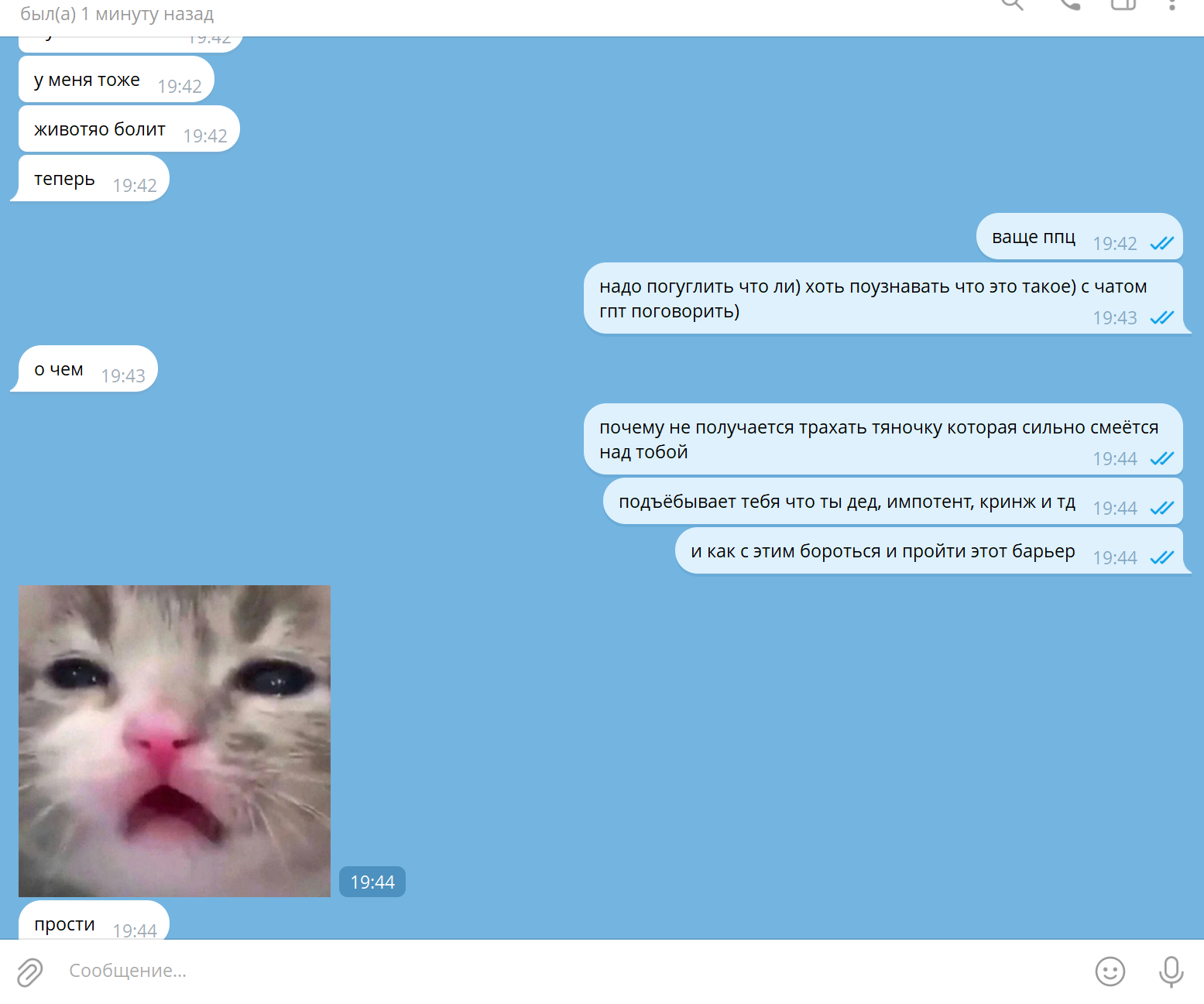 >>10386957 Это было на тот момент когда я написал ей что больше не хочу навязываться. Она ничего не писала мне кроме этого скрина. Что я должен на эту хуйню отвечать? Если бы она написала хоть что-то внятное еще, что-то спросила. Я бы нормально ответил ей и спросил бы в ответ свои вопросы. Спокойно адекватно. >>10386956 Я с ней спокойно обменялся сообщениями только что и больше не доебываю ее.