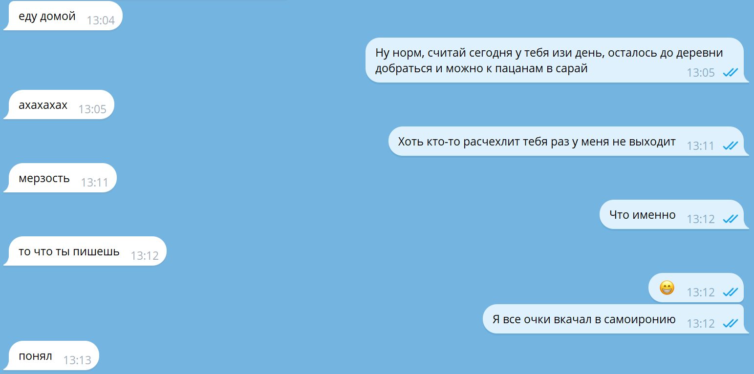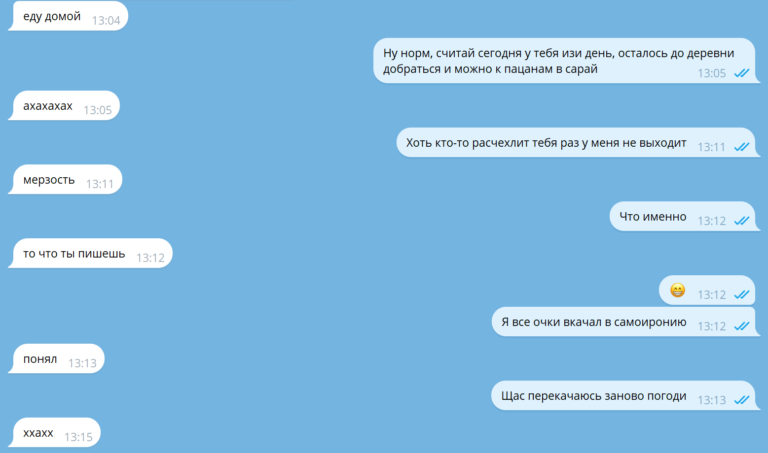 оп, ты говорил что у вас было общение нормальное, а можно какие то примеры ? потому что ну только не обижайся, у тебя представления о нормально нетривиальные