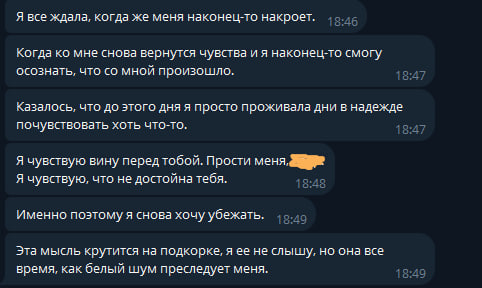 А потом она начала нести какую-то странную дичь, как на пике 1, извиняться постоянно за что-то, просыпалась ночью и говорила, как ей страшно, просила приехать к ней, говорила, что хочет покончить с собой, но не объясняла почему.