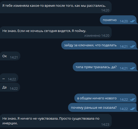 То ей бывший начал написывать, и пока я не сказал, типа ну может расскажешь, что ты уже с другим ебёшься, а она нихуя ему до этого толком не отвечала и даже была готова встретиться, и когда поднимала эту тему(ну я то думал не дура), молчал и думал, что сама решение примет. Там какие-то кринж истории рассказывать начала, которые, как мне кажется, ни один человек при желании нормальных отношений рассказывать не будет.