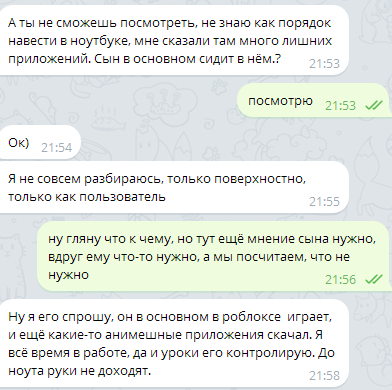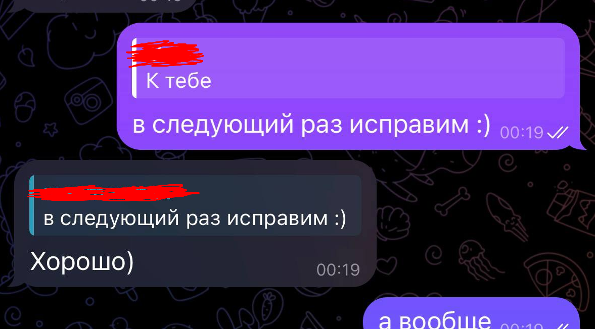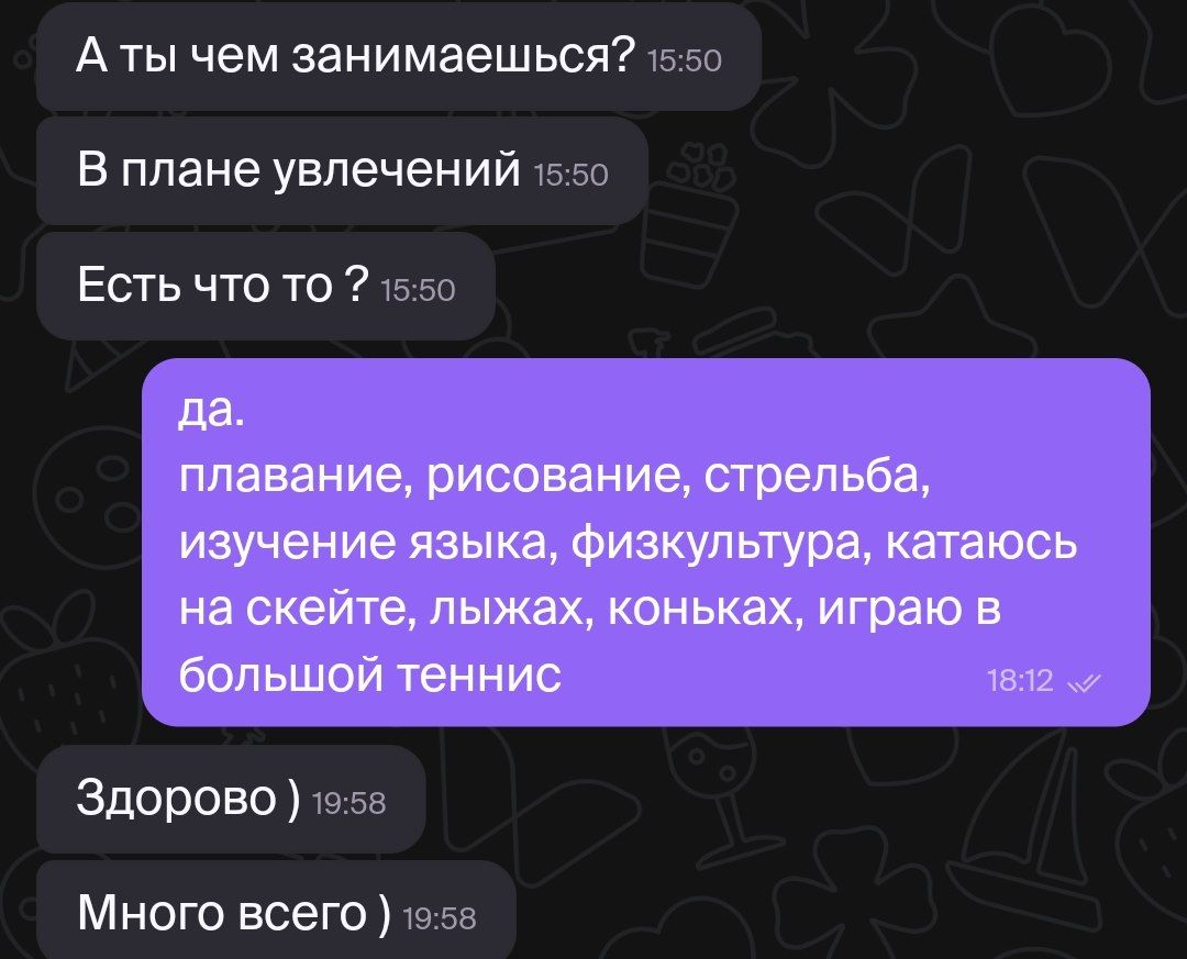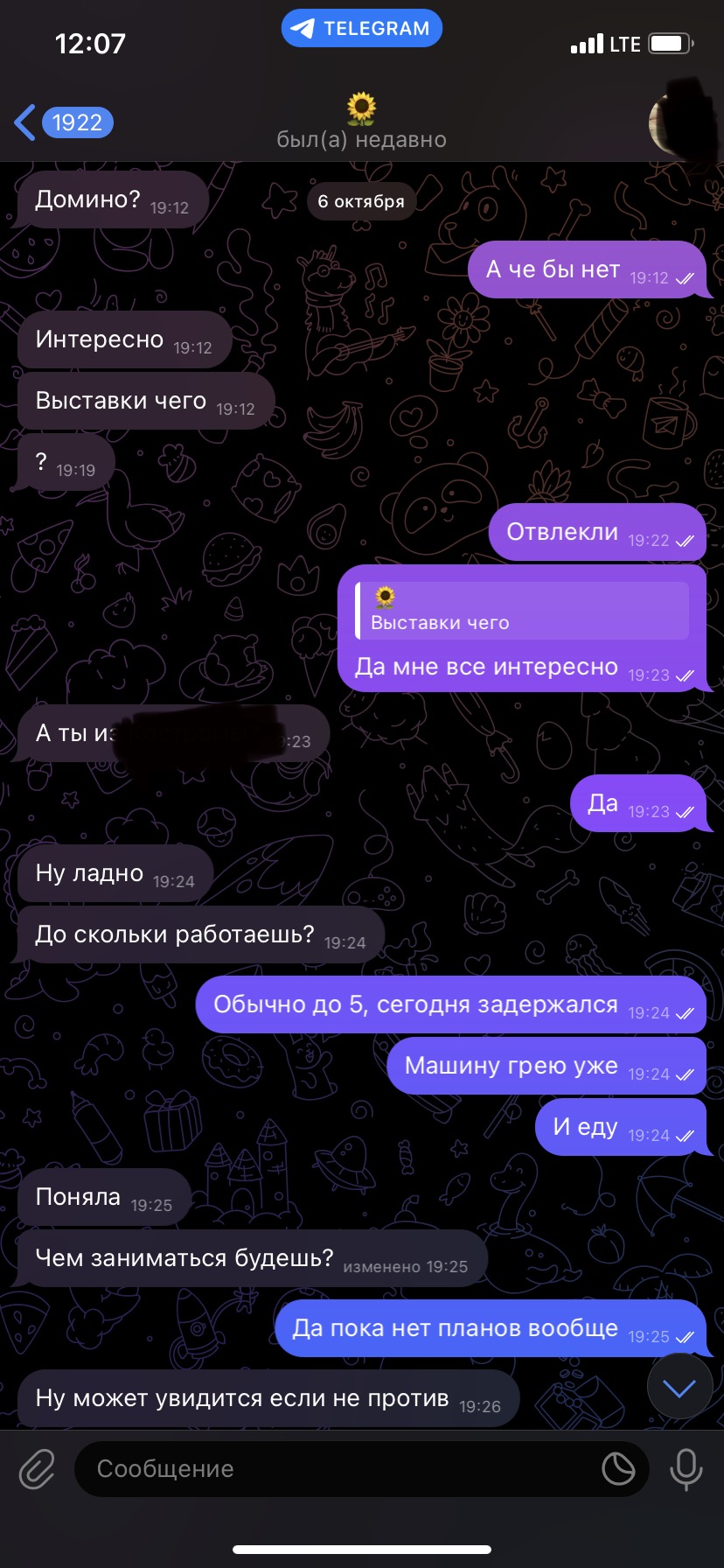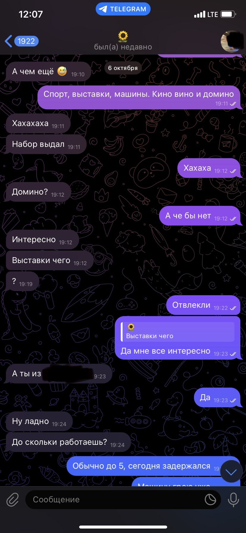 >>10403959 Сейчас гляну. Первый диалог: Тня поинтересовалась мой работой, в ответ на моё развёрнутое объяснение попросила уточнить, а после рассказала о своей. После я спросил её о хобби, но заменьжевался и не сразу перенёс разговор к своим увлечениям, которые все равно не пересекались. После был мой дежурный вопрос о том, чего нового и котроткий диалог о ремонте. Дальше моей дежурный опрос об увлечениях из анкеты и тишина. Короче, надо было оперативнее писать и активнее искать какие-то точки соприкосновения.