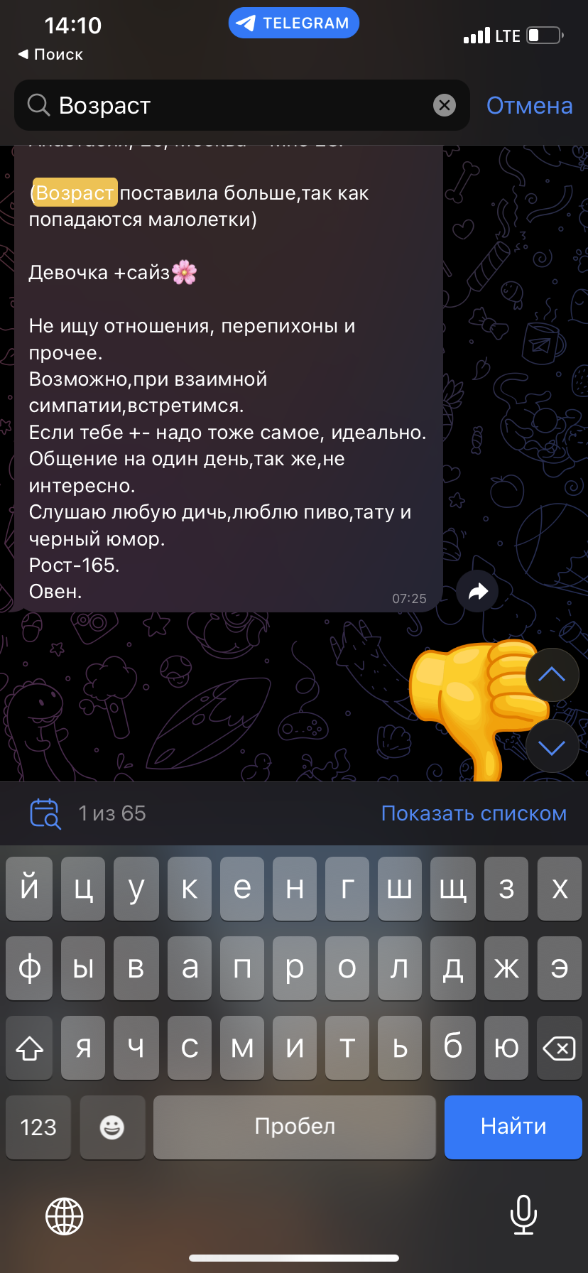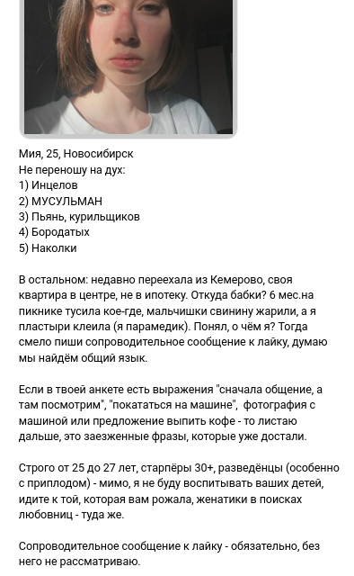 >>10399422 Да хуй ее знает. Я не читаю описание, потому что оно часто с реальностью не бьется. Поэтому и сам ничего не пишу, кроме роста >>10399474 Да блять, занижают или завышают возраст чтобы в выборку попасть. Дальше каждый сам выбирает по вкусу. Когда сидел в мамбе ставил вообще 34, чтобы милфы попадались, всем пох было. Так же в дв занижаю на пару лет, чтобы выхлоп больше был, тоже похуй, все в переписке уточняется же. >>10399443 Ну фотошоп это уже хуйня. На встречу то придёшь ты, а не тот кто на фото.