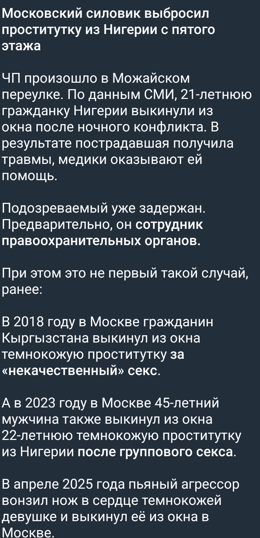 >>10408725 >Кто нибудь тут трахает лоу прайс негр? Да я. Правда в основном кубинских зумерш за 5-6к, они не то чтобы негры но черные очень даже >Что реально все настолько плохо Тут как придется. Есть неплохие, есть плохие Этот шарит >>10408726 если вызовешь к себе будет сразу видно что ты шлюху вызвал