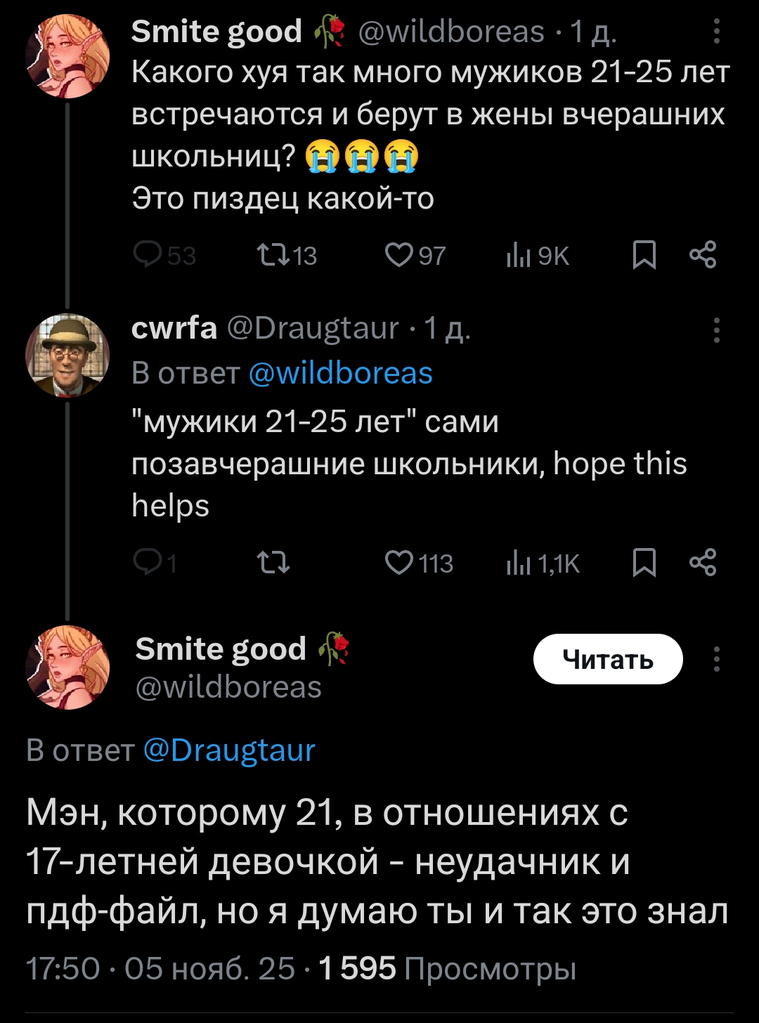 >>10410633 > Она всратая пиздец + ебалом на мужика похожа. Она мне зашла, ты то разумеется и от стейси нос воротить будешь. Да и потом - как будто у карланов выбор есть, серьёзно что ли. >>10410614 > я выделил на ресоциализацию У тебя пгт на 20к, но чсв как у бизнесмена из Москвы. Пиздец блять, вот так и ведут себя рослые. К