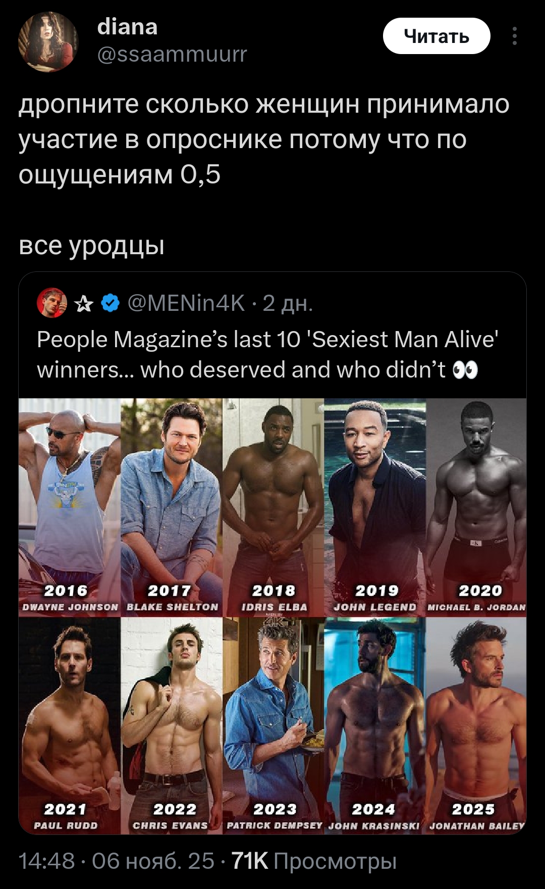 >>10410554 Ну если быть объективным, то пикрилы скуфыням в основном нравятся и колхозницам. У первых маскулинность роляет за счёт возраста и в целом поколение такое, а у вторых из за низкого интеллекта. Современной зумерше из большого города нужен твинк феминый с длинными волосами и тощий, офк с чедобудкой и от 185.