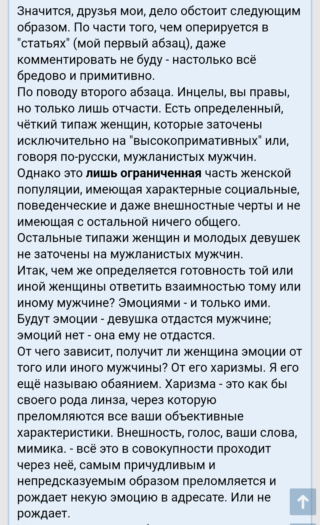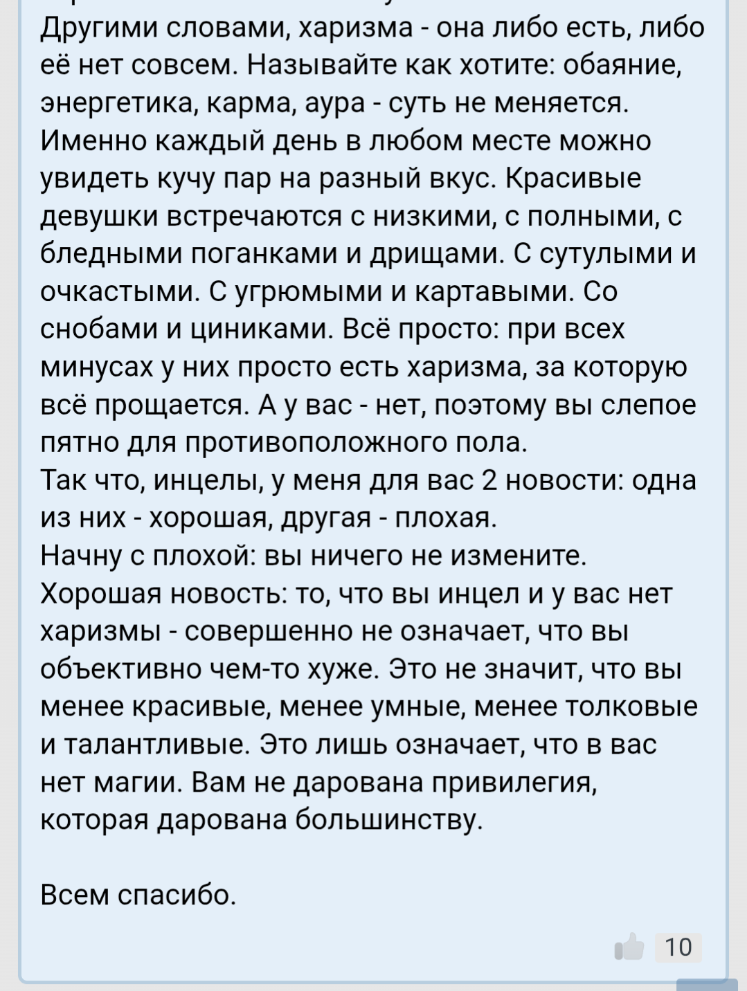 >Отсюда озлобление, такие простыни как у тебя, где инцел подсчитывает капельки внимания. Но у меня нет никакого озлобления. Скорее, чувство обреченности от осознания, что жизнь одна, другой не будет, и мне никогда не суждено прожить ее полноценною. Меня лишь удивляет, как другие такие же обычные мужичики живут и не парятся! Воспринимают все, как должное и думают, что подобное - норма.