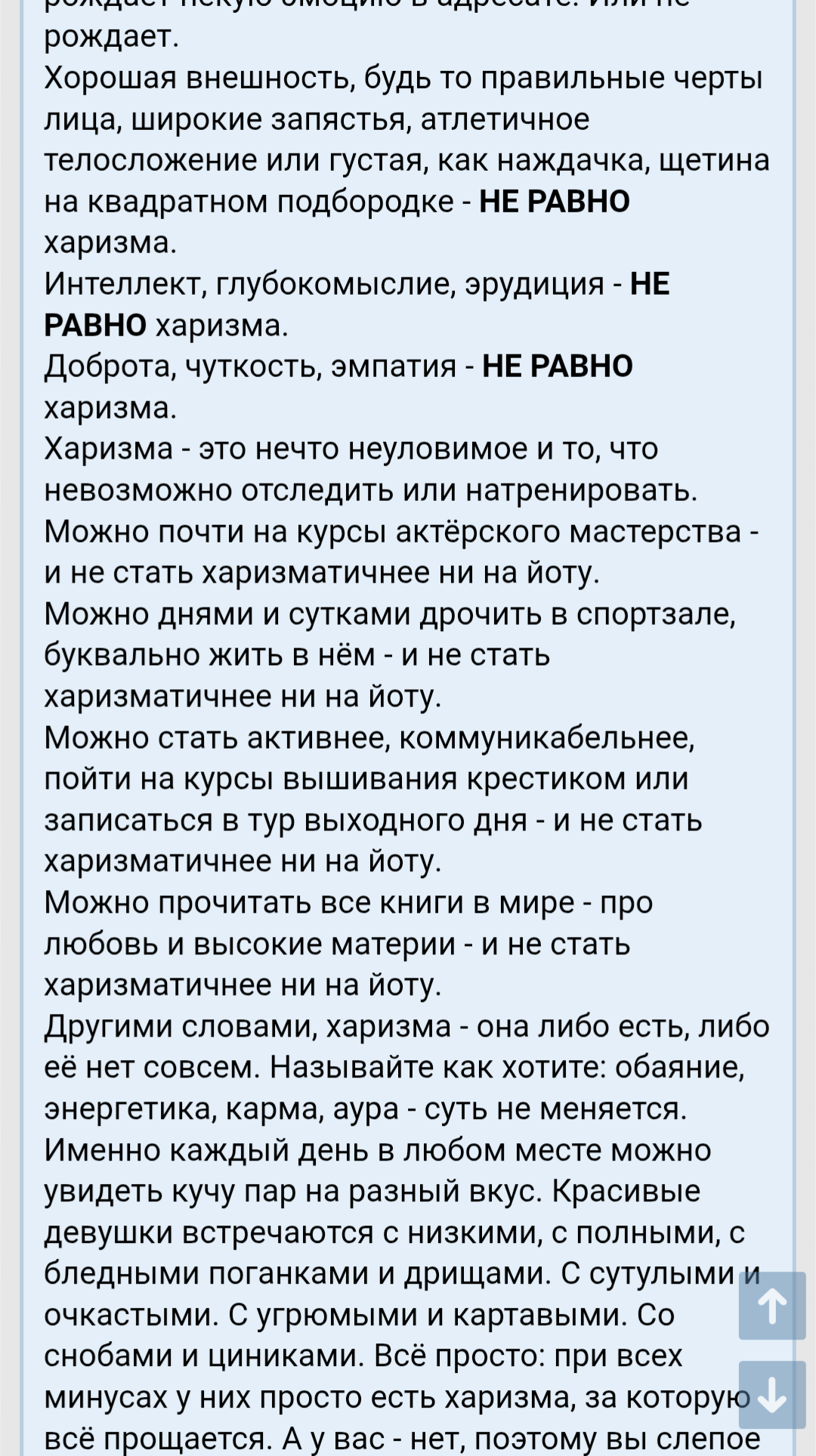 >>10410578 Шизик на правильном пути, только он не понял, что харизма появляется в результате красивой внешки, без которой любая попытка не быть чмом воспринимается как выебоны всратого дебила.
