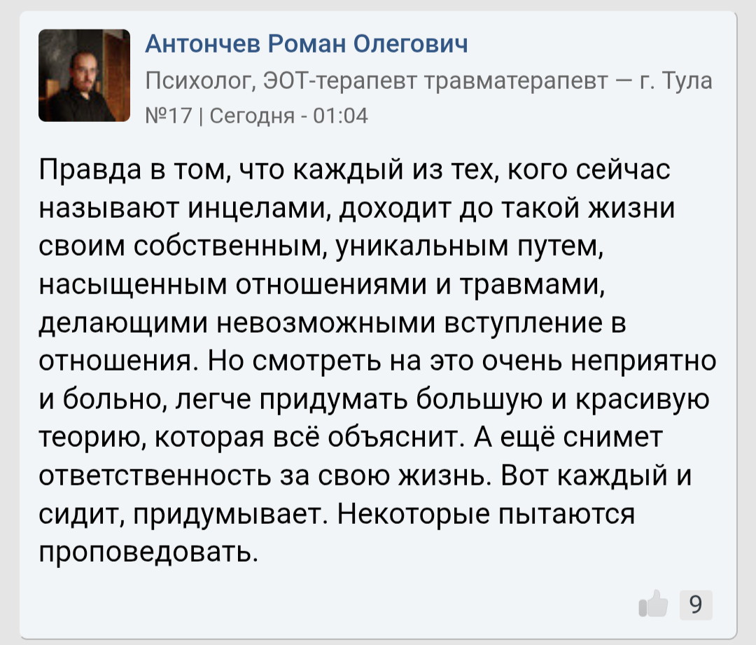 Но не в этом суть. Мне больше интересно почему леваки инцелов отменяют и не пускают в свой клуб угнетённых. Из-за женоненавистничества? Но ведь не все инцелы женщин хейтят. Или всякие Элиоты Роджеры репутацию подпортили?