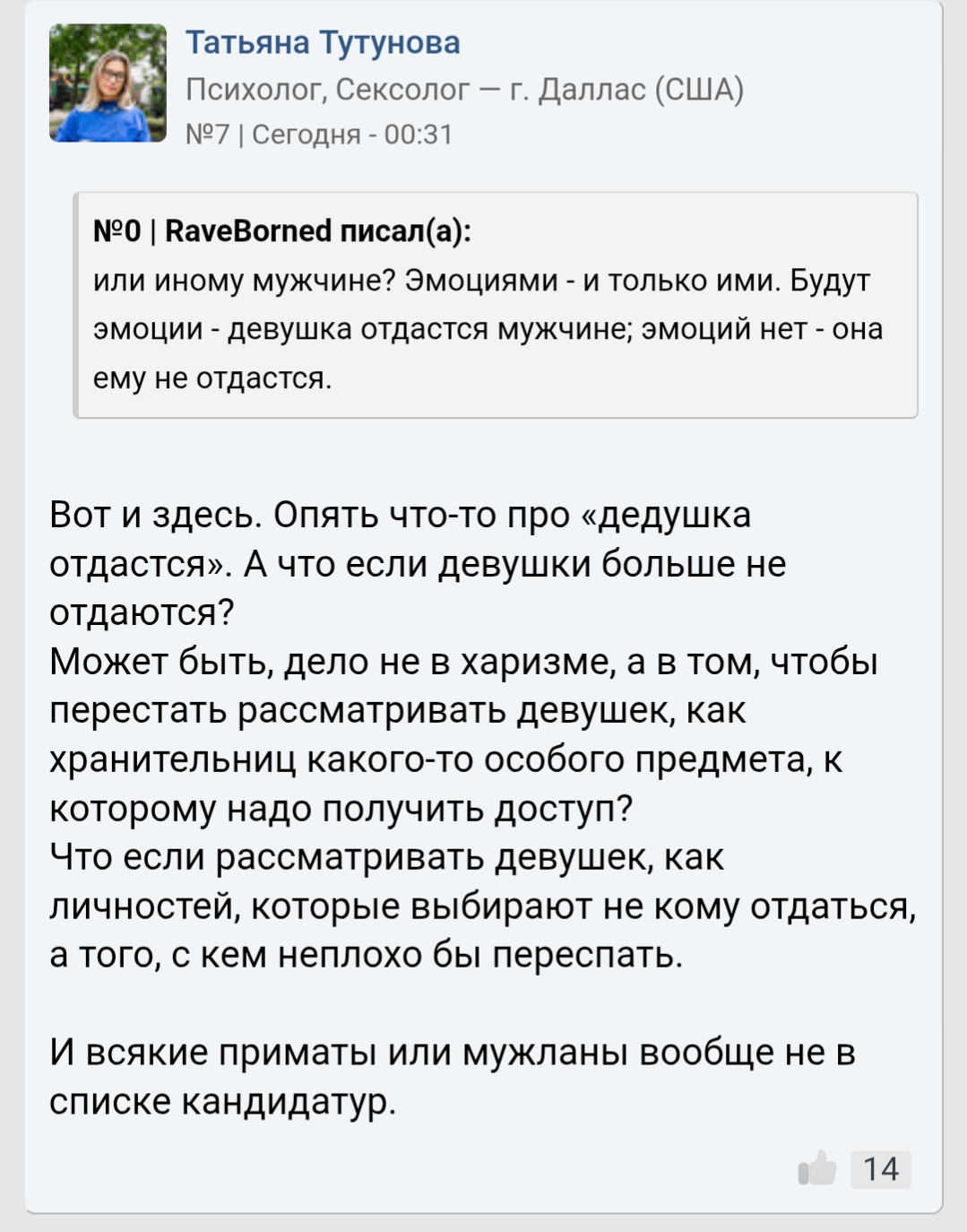 Кстати, вот иногда также задумываюсь, смотря на поведение мужчин с женщинами, как можно, будучи настлько тупым, вообще прожить так долго? Это же где-то за гранью выживаемости. А потом понимаешь, что эти мужчины, в принципе, могут вообще-то быть довольно умными, наверное, даже умнее меня, могут быть профессионалами, программистами, там, какими-нибудь. У них просто, как бы, интеллект в каких-то областях включается, видимо, и он может быть даже вполне неплохим, но в этой области он у них отключается просто полностью напрочь.