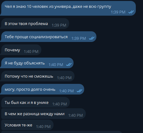 >>10430441 Знакомо. Меня мать бить и унижать начала с самого моего раннего детства, не водила в сад, в секции, не занималась здоровьем. Я рос очень забитым, закомплексованным, полнейшим неумехой, физически крайне слабым. Первые годы в школе были ещё ничего, а вот позже уже началась травля, потому что я всегда был странным. По итогу - полный лузер во всем. Но что обидно, что я всю жизнь плыву по течению, превозмогать и выбираться даже и не пробовал. А теперь локти кусаю, потому что уже слишком поздно. И последние несколько лет ломаю голову, был ли у меня шанс выбиться в люди, перестать быть нищим, найти свое дело, заработать денег и т.д.