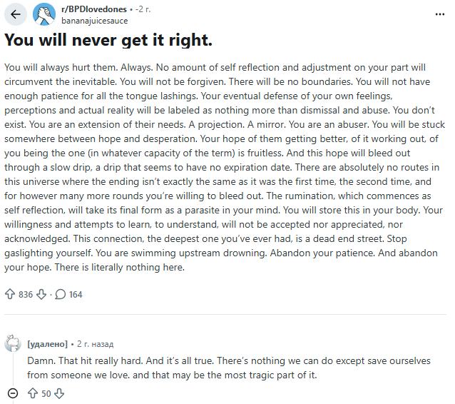 >>10435679 Разница для меня наверное в том, что она у сама это понимает, и даже как-то пытается это решать (не особо успешно, в прочем без таблеток и терапии тут в целом не развернёшься особо). Если бы она этого НЕ понимала и НЕ хотела идти на терапию сама - я бы уже давно ушёл, как бы я её там не любил. Да и как-то после полутора лет сказать чао-какао уже язык не поворачивается, чую если дойдёт до этого - хоть какой-то пиздец ожидать стоит.