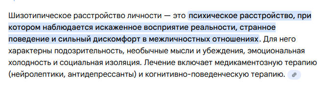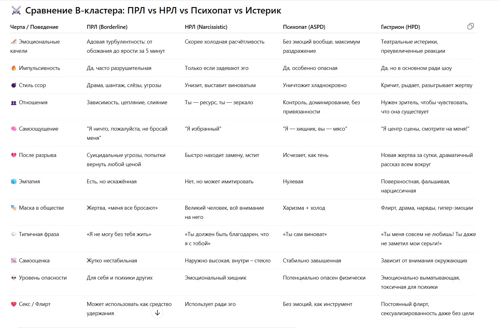 Помни, что некоторые беды с башкой просто требуют определённого подхода (ОКР, СДВГ, аутический спектр), и счастливые романтические отношения с такими людьми вполне возможны. Некоторые - надо уже смотреть и ДУМОТЬ (Зависимое, Избегающее, Тревожное расстройство). А вот от Нарциссического, Истерического и особенно Пограничного расстройства крайне рекомендуется держаться как можно дальше; во всяком случае, для построения серьёзных длительных отношений.