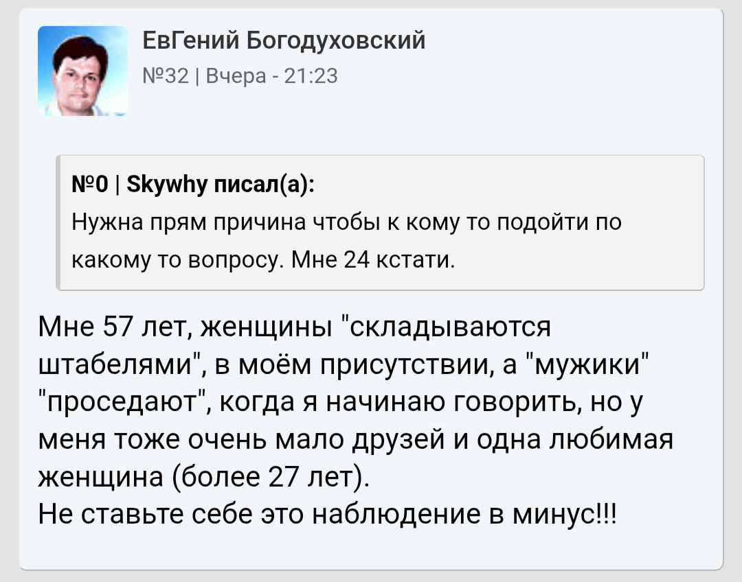 >>10459003 У него хоть друзья есть, с кем можно время провести. Уже неплохо. Это не считая того, что его и женщины на кофе зовут. А ещё у него рост 186. А я бы просто был рад хотя бы одного настоящего друга иметь