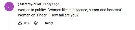 Я вот решил бабам не помогать, если они окажутся в беде там или помощи попросят, нахуй надо. Раз не считают всех кто ниже 180 за людей, то пусть ждут помощи только от 180+.