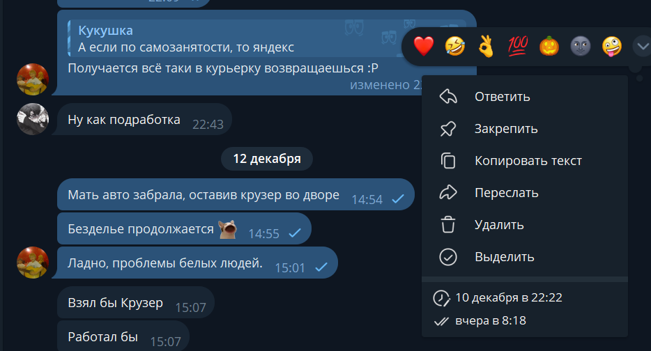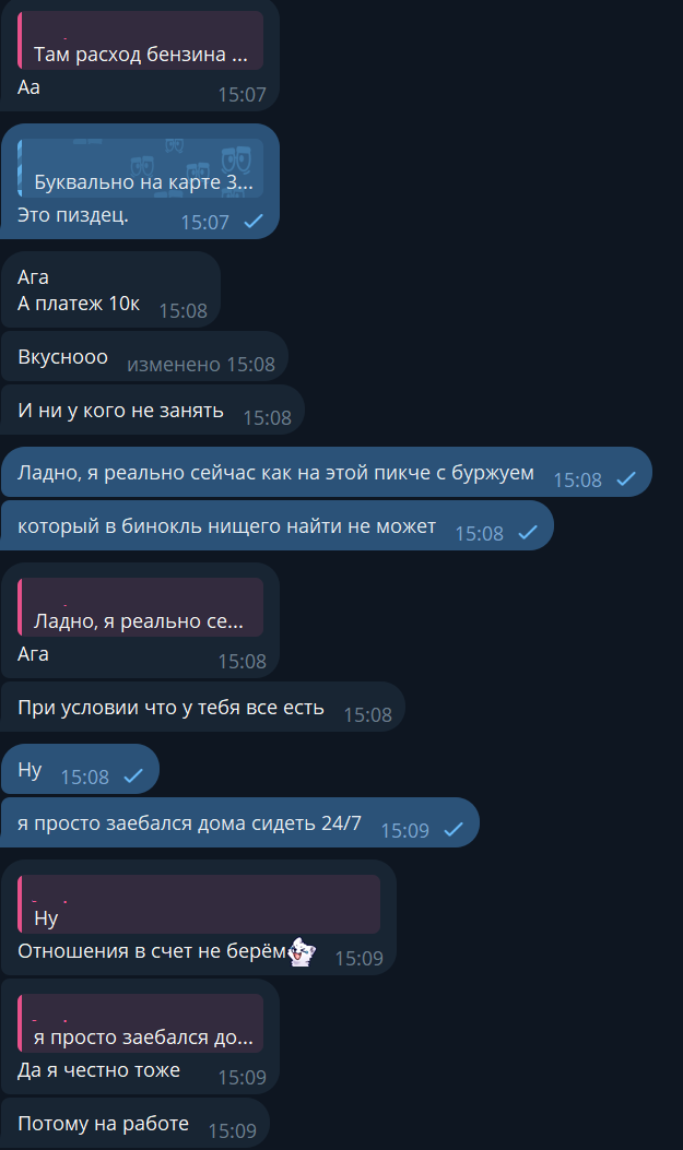 Сегодня Л зачем то переписку нашу глянула с утреца, при том что у неё отключена функция прочитки сообщений в тг на телефоне. Видимо чедик отказал, думает о чём то. К