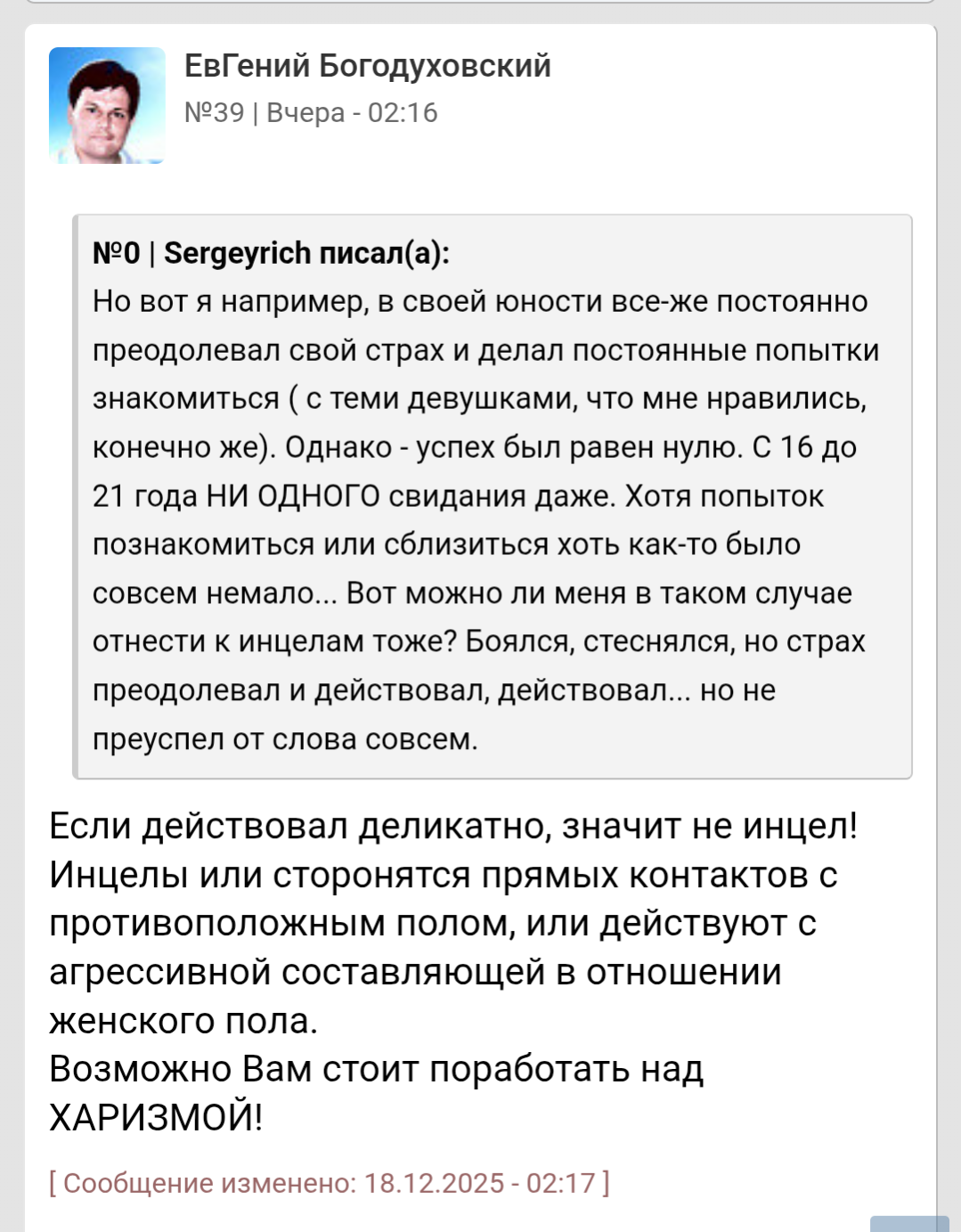 Коротко, кун 0/10, отвратительная внешка, долго ходил в зал и стал жимцелом, 177/93, но привлекательнее для тянучек от этого не стал. Качал харизму, развивал навыки, но как был фулл сет верджин, так и остался. Затем пришел к тому, что все это адиафора, что я по природе рожден таким и нечего этого стыдится, у меня не получается завести отношение. Можете срать меня, говорить что я генетический тупик, что я не выполнил самое главное предназначение - продолжить свой род и все такое прочее. Я все это уже принял, такова моя природа, я не стану ее менять. Таков замысел владыки, как говорится. Но я начал развивать другие свои таланты, которые открыл на пути к этой цели. Поднялся на работе, стал тим лидом, не плохо получается тянуть всяких студентов, наставлять их и прочее. Помогаю племянникам, обустраиваю им жизнь. Можете говорить, что это тяжелейший коуп, ну ок. Я думаю, что нашел свое предназначение.