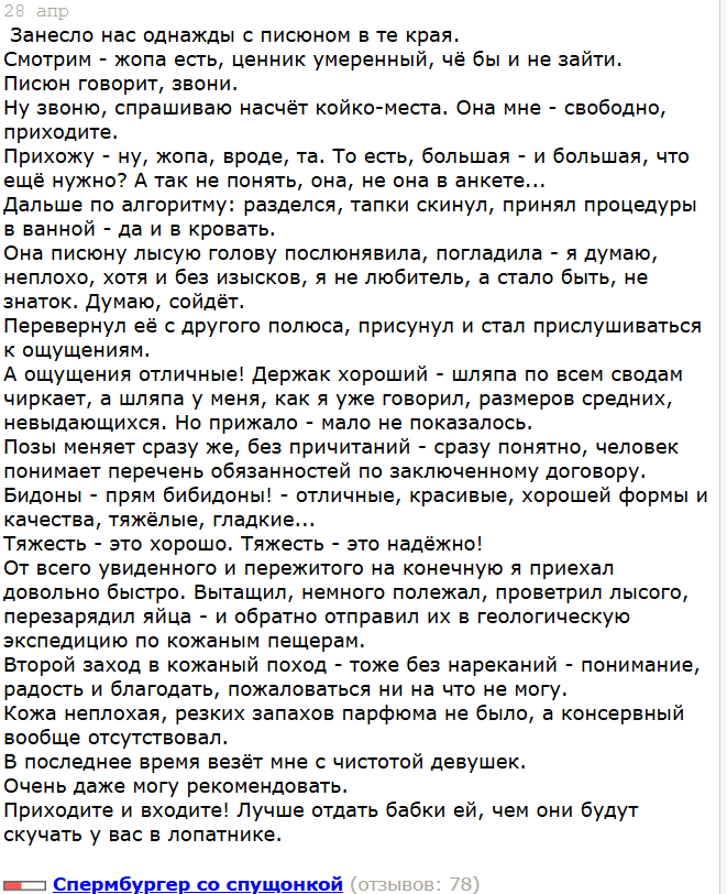 Сууука, крокодил попался. Думаю ладно, может фигура как на фото и типа того, а хуй там, амёба ебучая. Конечно же мистер вялый на такую хуйню. Хотя в отзывах пиздец расхвалили, топ-жопич все дела. В прошлый раз же зарекся ходить, опять, блять, полез. Хотя даже за ту же цену предыдущая была симпатичная, но она хуево возбуждала, чувствовался похуизм. Похуй, наяривал свой чин-чин, вошел в нее и... нихуя не почувствовал, 0 возбуждения, упал. Вот че мне, блять, первого опыта похода не хватило. Думал, получше найду. В пизду этот гринд, трата бабок и времени. Лучше дальше на нейро-хентай дрочите, хикканы, вот вам мой совет.