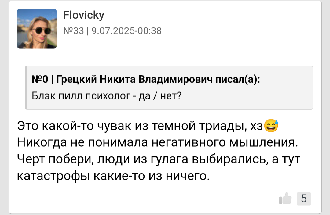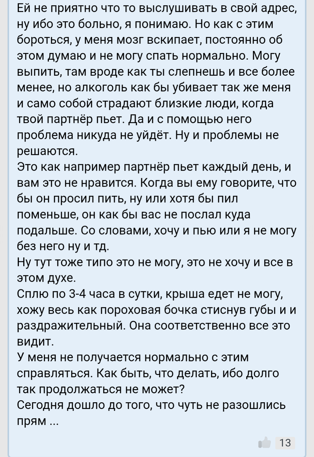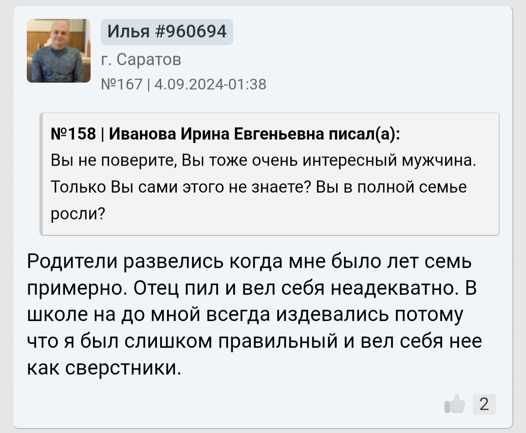 А теперь представь каково мне было, когда в графе "отец" в свидетельстве о рождении у меня записан был дед, потому что отец сказал "не похож не меня" и съебался. При том, что все его следующие дети в другой семье похожи на меня (я их видел в интернете). А про мать у меня всего пара моментов в памяти. Она была пьяница конченая, её мать(моя бабушка) выгнала её из квартиры навсегда и заодно еще лишили родительских прав. Добавь к этому нищету, травлю в школе "ХА ЛОХ ЕБАТЬ БЕЗ РОДИТЕЛЕЙ", побои и унижения дома, слабое здоровье и отсутствие желания жить... Че как, нормально? Это я далеко не вдавался в подробности.