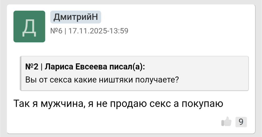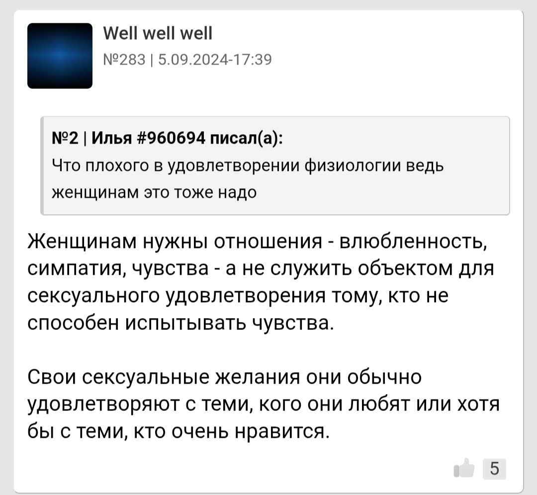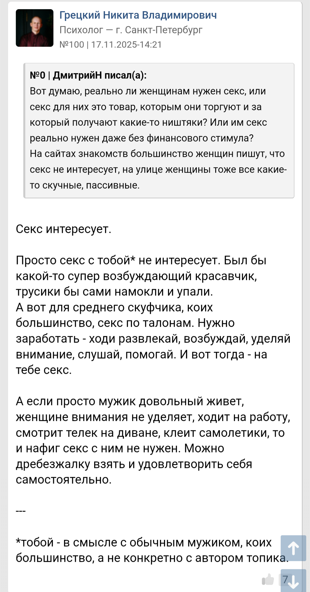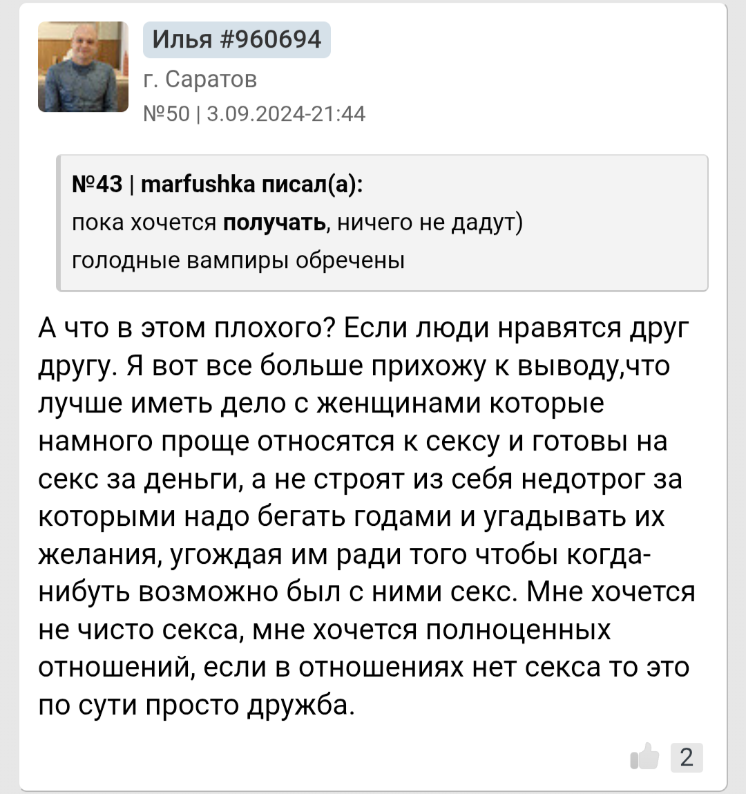 Почему я не удивлен его внешнему виду... И ведь так считает огромное количество мужиков, что для женщины секс приемлем только в отношениях, как некая плата за ништяки от мужчины. Сука, ну как так то