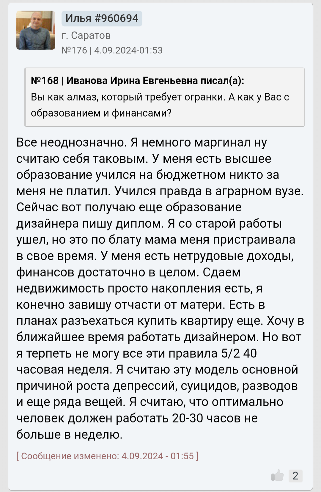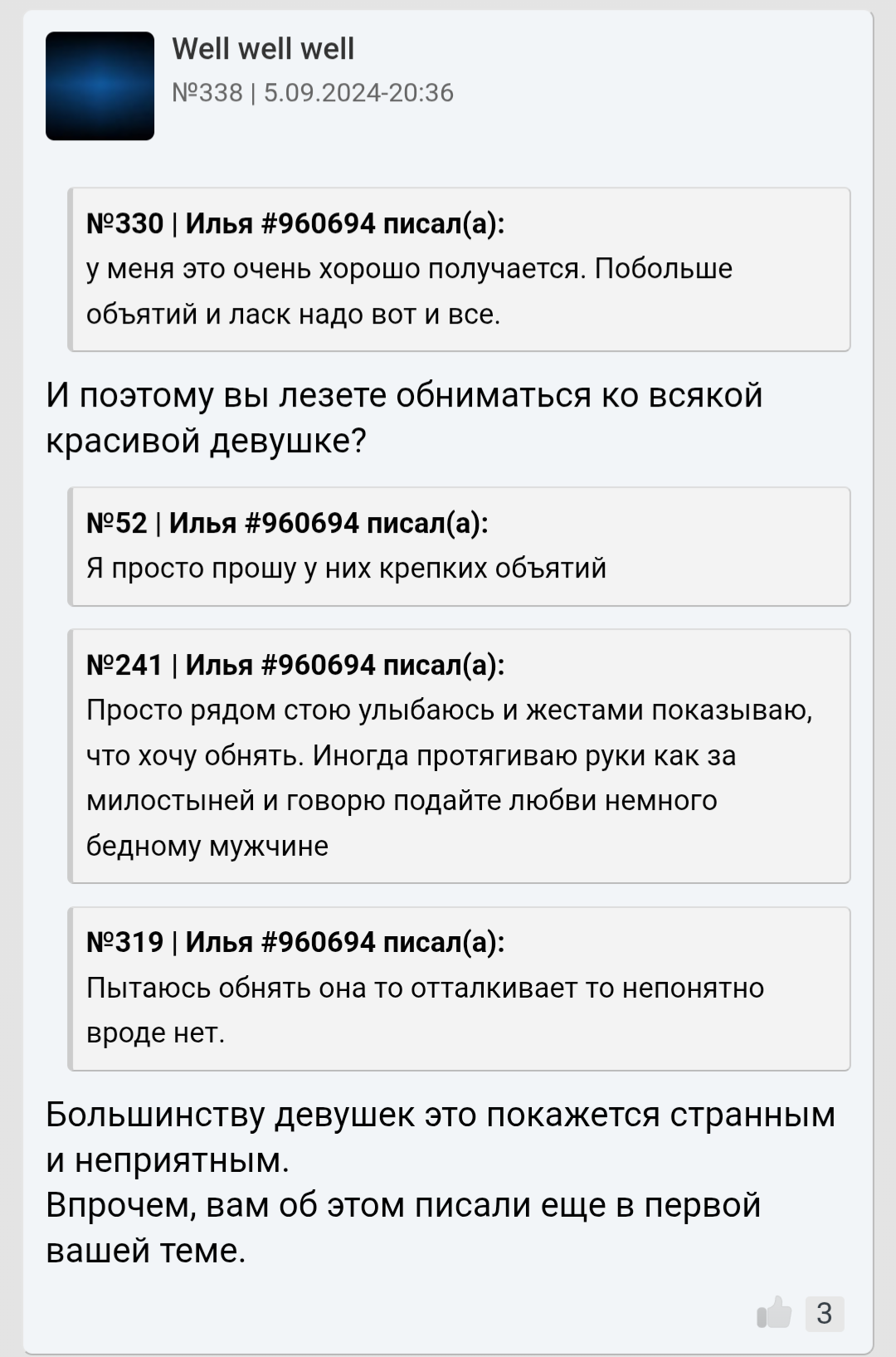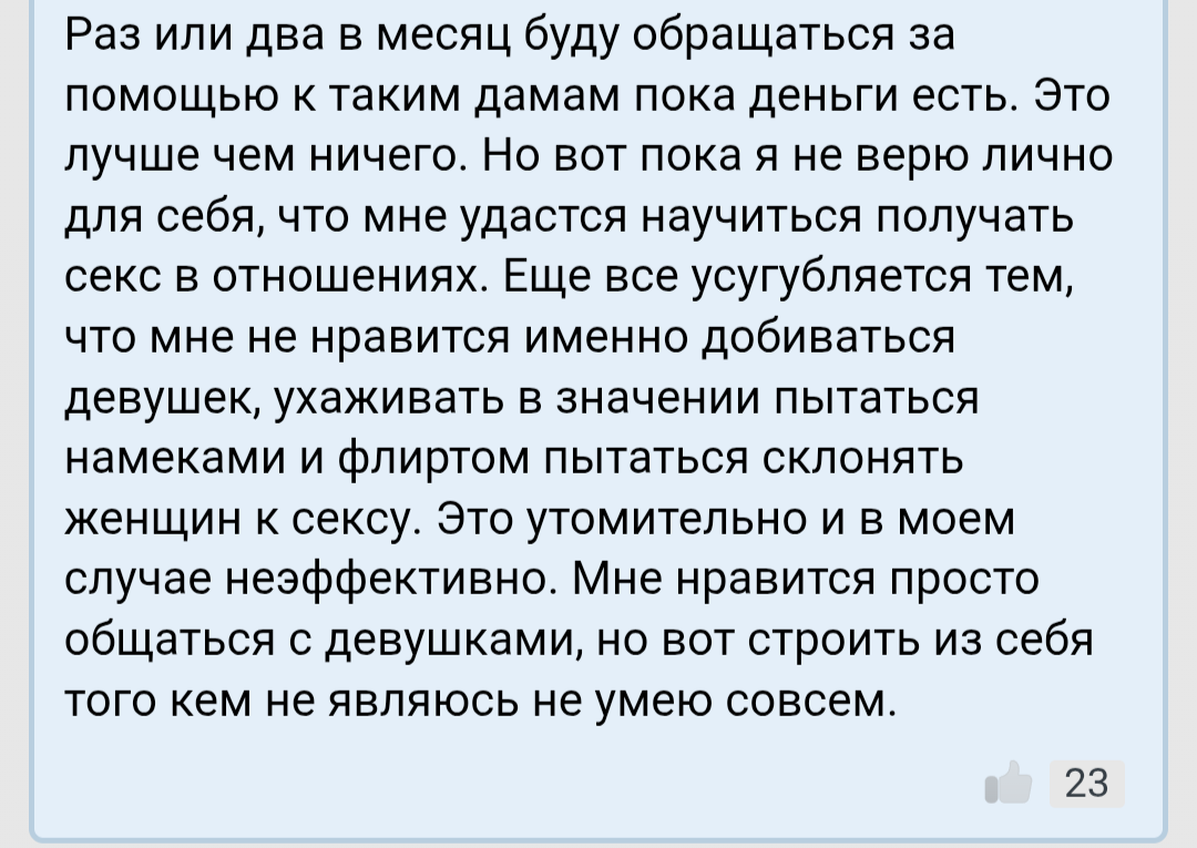 То есть если я очень захочу, полностью сконцентрируюсь на этом может получится и повторить. Но цена слишком высока. Но было прикольно ощущать что я наконец-то взял изменил всю свою парадигму жизни, что можно по своей воле перестать быть инцелом. Я даже что-то писал в тред такое типа " надо просто взяться за себя". А потом деньги кончились времени нету и всё вернулось на круги своя