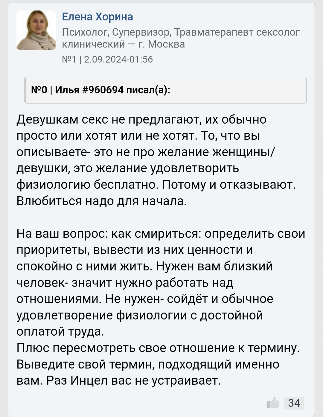 Проститутки это древнейшая профессия, которая и за отсутсвия наблюдений за чедами и меньшей рефлексии лечила инцелизм издавна. Если ты можешь получить секс только за деньги тысячу лет назад - да и похуй, ты другой жизни не знаешь и не видел, так само случилось по совпадению причин, которых ты не осознаёшь. Инцелизм же это чисто продукт западной цивилизации, где какая-то сакральная любовь и теплые отношения от окружающих кажутся благом, без которого нельзя выжить и нельзя эти законы натянуть себе на хуй воспитанной силой духа и характера. Всё равно и за культурной прошивки будешь хотеть какого-то тепла, как у кого-то другого.
