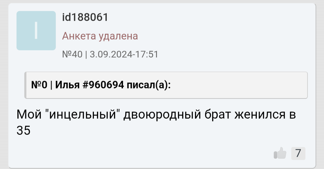Термин «инцел», который он к себе применяет, есть добровольный отказ от свободы. То, что его не травили, доказывает: его тюрьма не эмпирическая, а метафизическая. Он не жертва внешнего мира (феноменов), он жертва собственной лени и трусости. Он боится не отказа женщины, а необходимости признать себя активным субъектом, несущим ответственность за свою судьбу. Легче объявить себя дефектным (фатализм), чем работать над культурой общения.