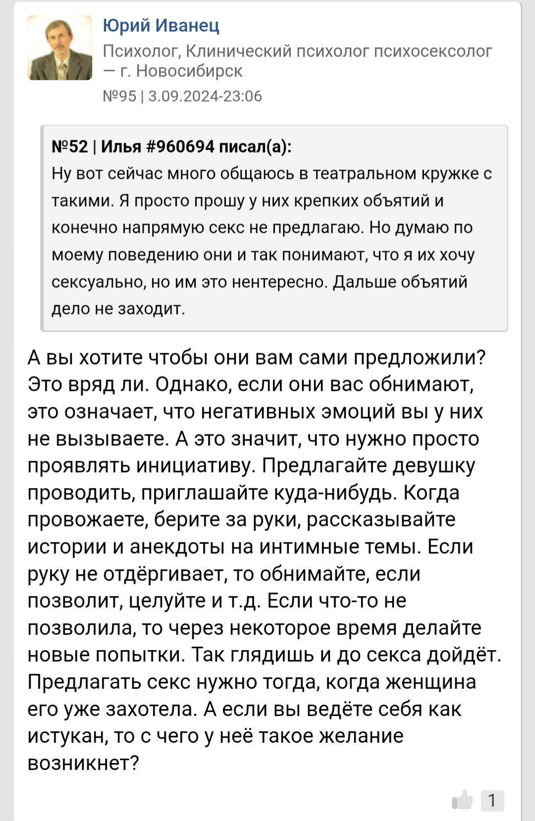 Я составлял план общения готовился к свиданию придумывал маршрут и темы для общения шутки. Я вряд ли уже смогу это повторить , у меня нет столько времени и начал лысеть вдобавок.