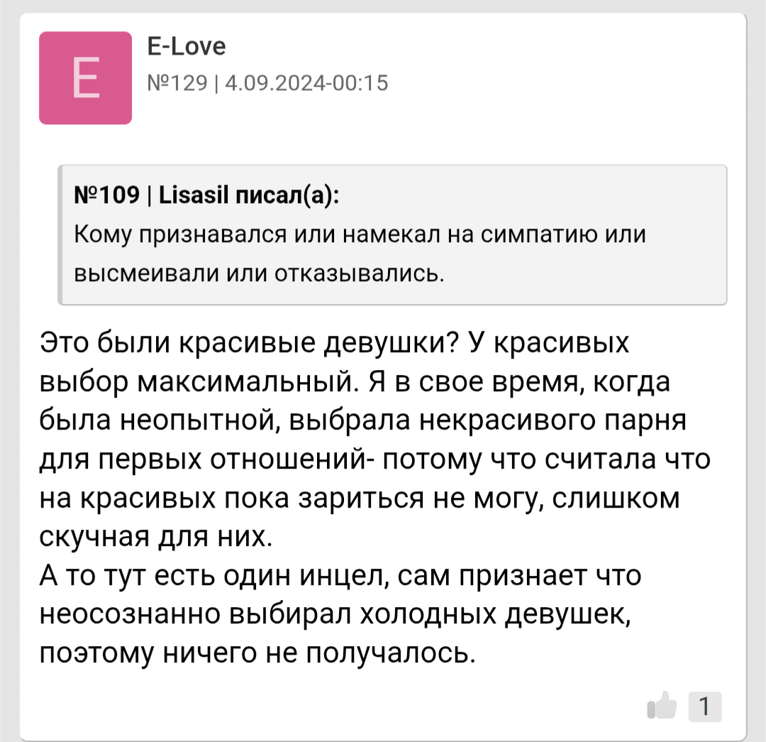 Инцелы, ходите к шлюхам и мозги не ебите. Вы ничего не знаете о любви и никогда не узнаете, уже не говоря о том, чтобы тяночки сами к вам клеились. И по-хорошему, это вас вообще ебать не должно.