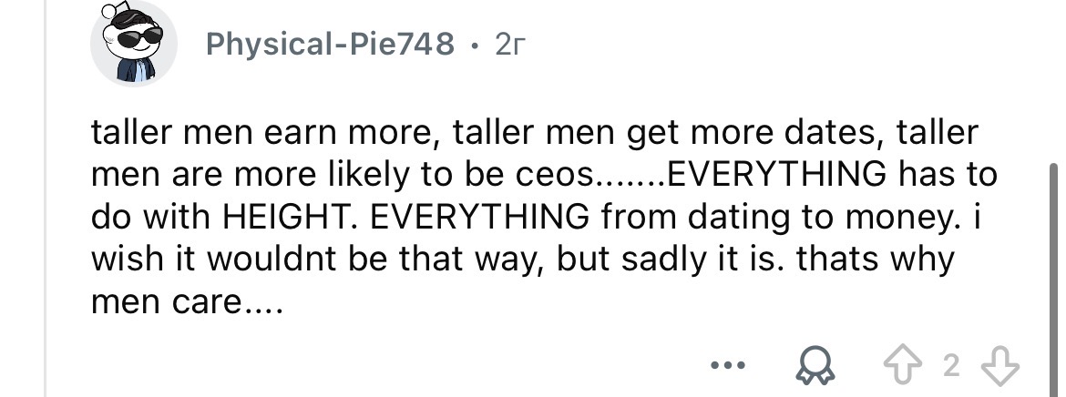 >>10503141 Да вот нихуя. Высокие тянки в принципе зачастую согласны на тех кто хоть сколько-то серьёзно выше при этом имея сильно более низкие к таким требованиям к ним вообще. Во всех парах где я видел всратанов с тян они, и тян и всратан, были выше меня.