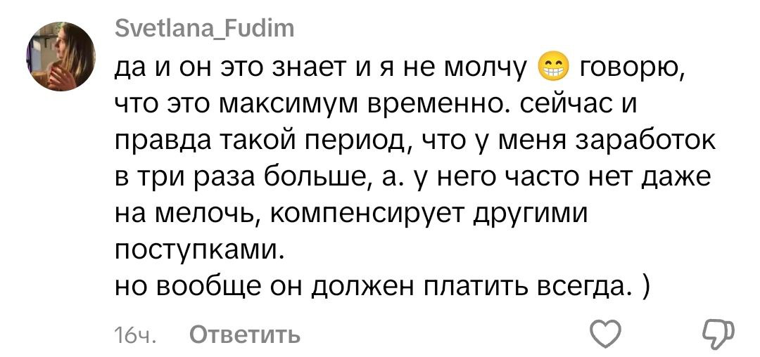зарабатываю на 70к больше чем мой мужчина, спонсирую его пивом, еда и маркетплейсы тоже на мне. он ваще ничего в свою шаражку не покупает (у меня и у него есть квартиры, живем у него).