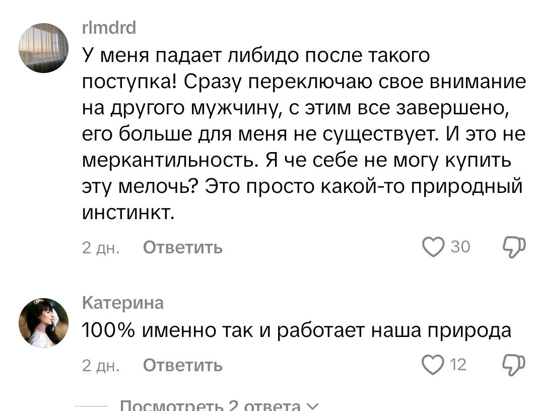 Ее тейк про "безопасность" не более чем прикрытие потреблядства и тяге к богатой жмзне не обладая чем то свыше чем то, что дала природа. К сожалению не ноготки, новые сумочки или штаны никак не важны для выживания новой ячейки общества или совместного ребенка. И бабы опять забывают, что муж с большего обеспечивает и помогает и так в повседневной жизни. Не говоря уже о дисбалансе подарков а праздникам. И на период беременности и первых 1-3 лет ещё и обеспечивает всю семью.