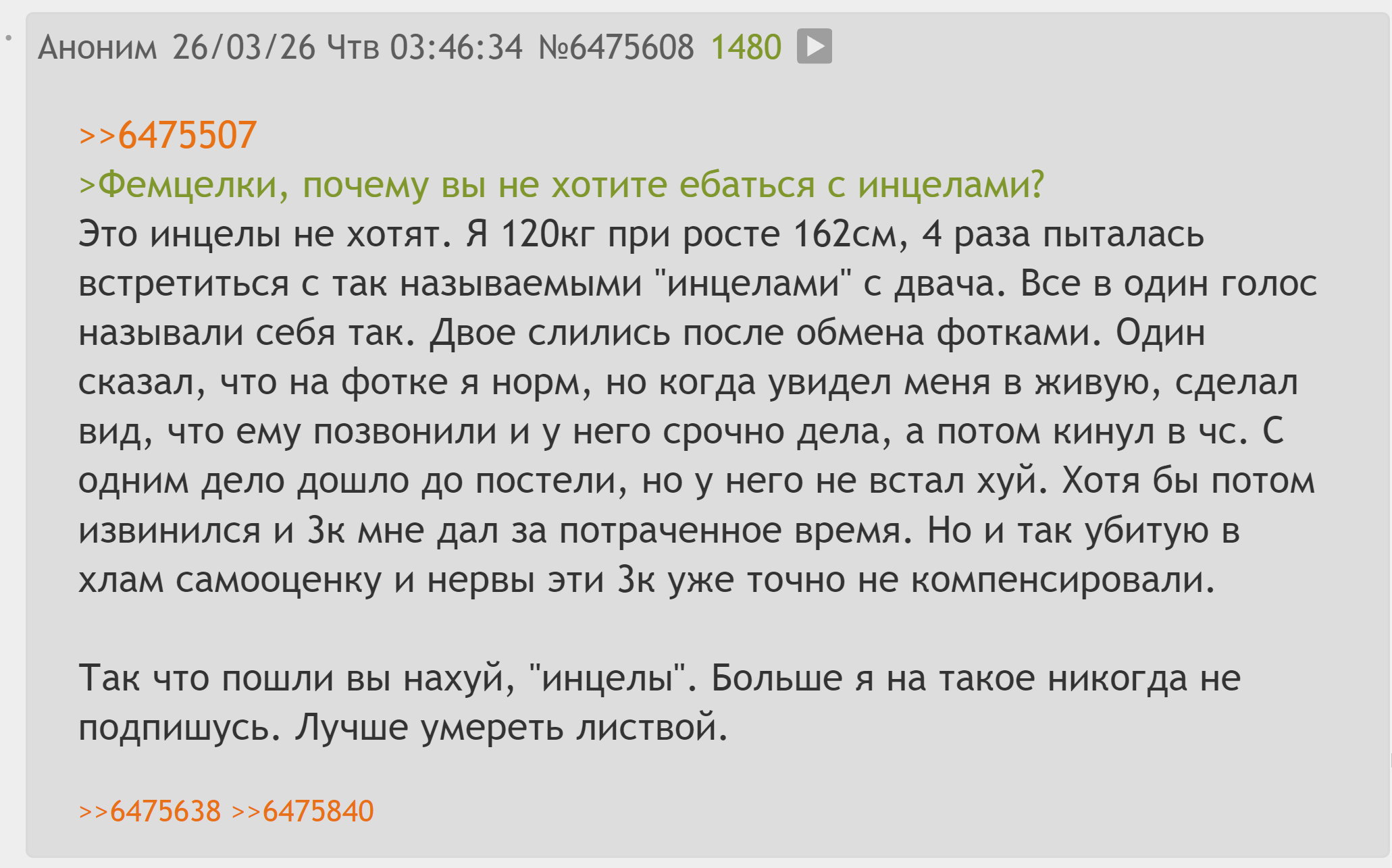 Да, я инцел. Я нигде не работаю, живу с мамой в саратовской хрущевке и редко когда выхожу из своей провонявшей потом и засохшим спермачем комнаты, где я сижу целыми днями перед заляпанным мониторам, дергая свой крохотный фимозный хуек. Да, я инцел и в том, что мне на хуй не прыгают стейси виновата недоразвитая максилла и карликовый рост 182 см.