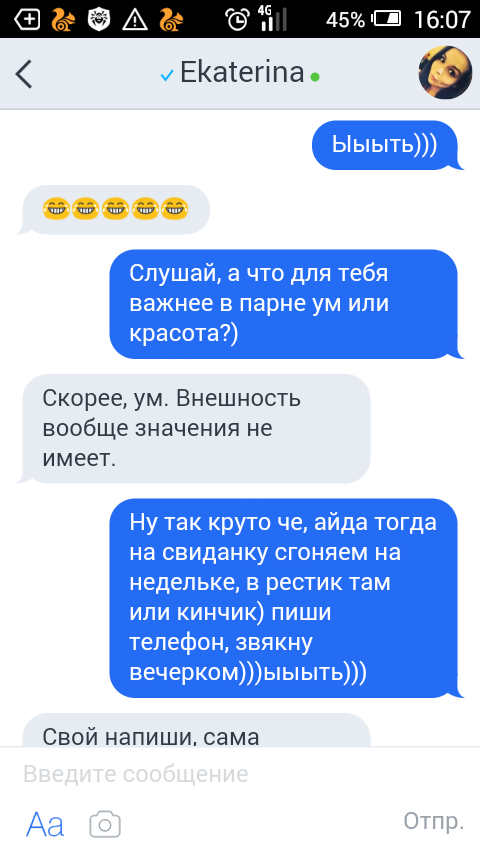 Но это я уже занимаюсь полной хуйнёй, я понимаю. О вкусах не спорят. Я просто написал хуй пойми почему, не мог не написать, кому нахуй интересен мой вкус. Там было удивительное сочетание ебейшего роста, стройности но при этом и ебейших аппетитных форм, в виде достаточно вкусных булок и поднятой жопы. Да и грудь у нее есть. Но всё это вызывало бы отторжение, будь у типичной пафосной соски. А тут простенькая бабца на маршрутку, миленький голосок, миленький разговорчик, я слушал минут 15. Ну я и запал.