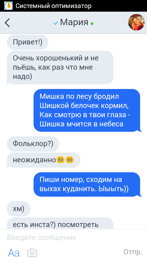 >>10315809 Говоря о анкетах без фоток , возможно это актуально для небольших городов кончено , как я говорил выше живу в 100к население и тут я цеплялся за каждую анкету так как их не особо то много , а уж которые активные или с фото так вообще, поэтому выжимал из общения все что мог, ибо либо да либо улетаешь в чс если что то пошло не так:D В следствие этого ИСКЛЮЧИТЕЛЬНО ПО МОЕМУ ОБЪЕКТИВНОМУ МНЕНИЮ я и вкачал скил общения на сз.